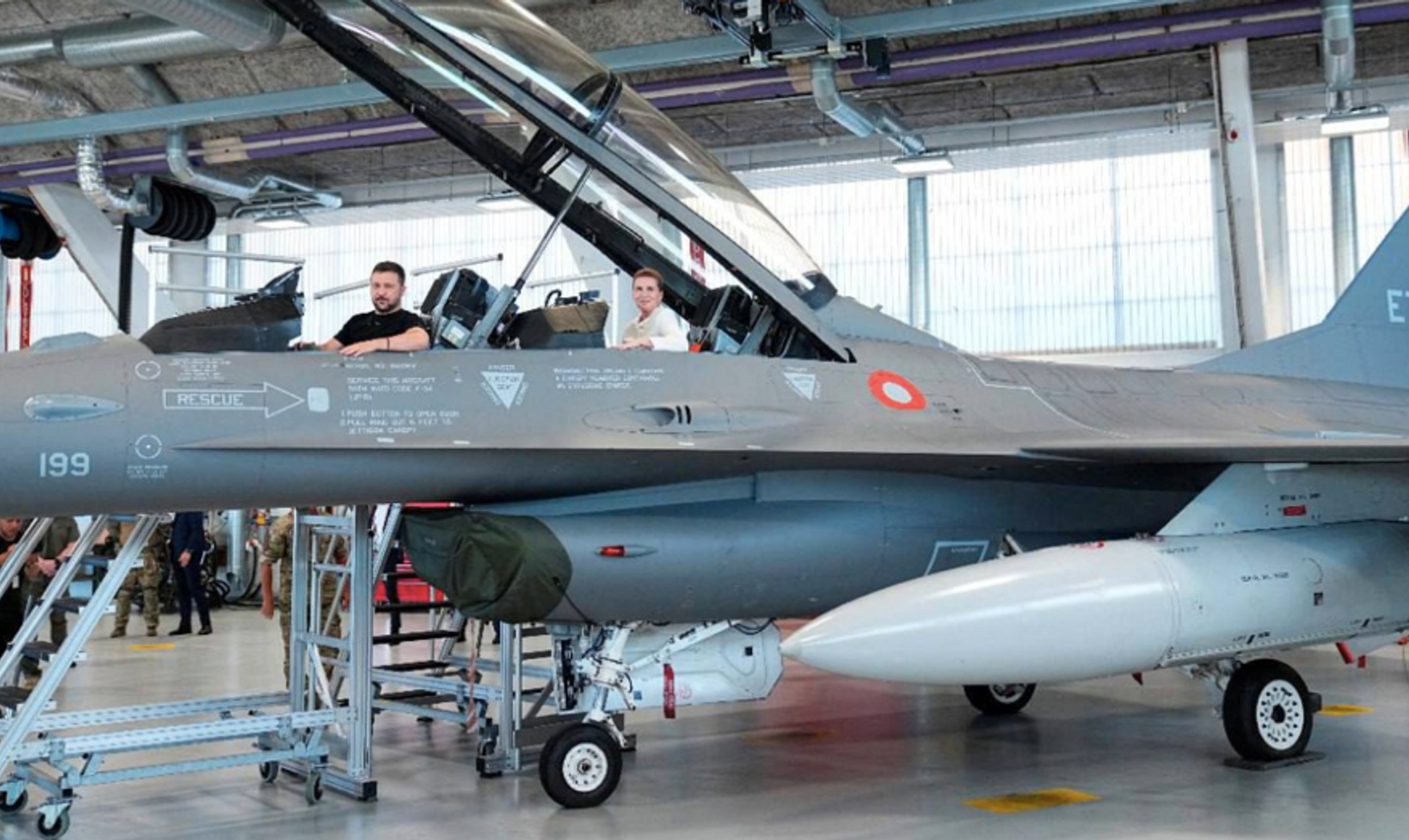 Президент Украины и премьер Дании осмотрели один из самолетов на военной авиабазе Скридструп и вместе сели в кабину. Самолеты будут переданы после того как украинские пилоты пройдут обучение.