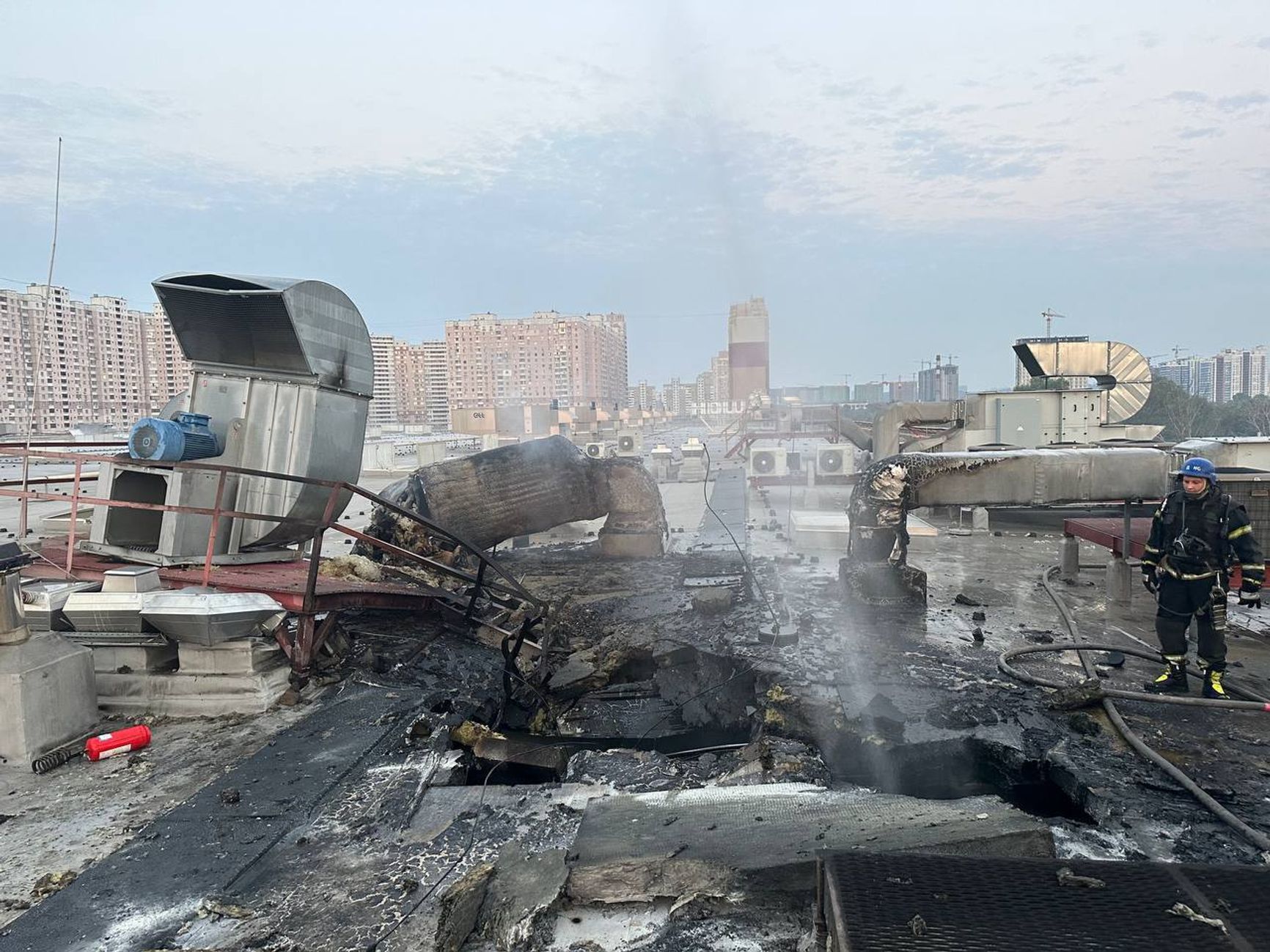 Мэр Киева Виталий Кличко также сообщил в Telegram, что в Дарницком районе обломки упали на крышу торгового помещения. По данным украинского МВД, речь идет о гипермаркете «Ашан». В Фастовском и Бучанском районах Киевской области возникли пожары и были разрушены жилые дома, сообщает ГСЧС Украины.