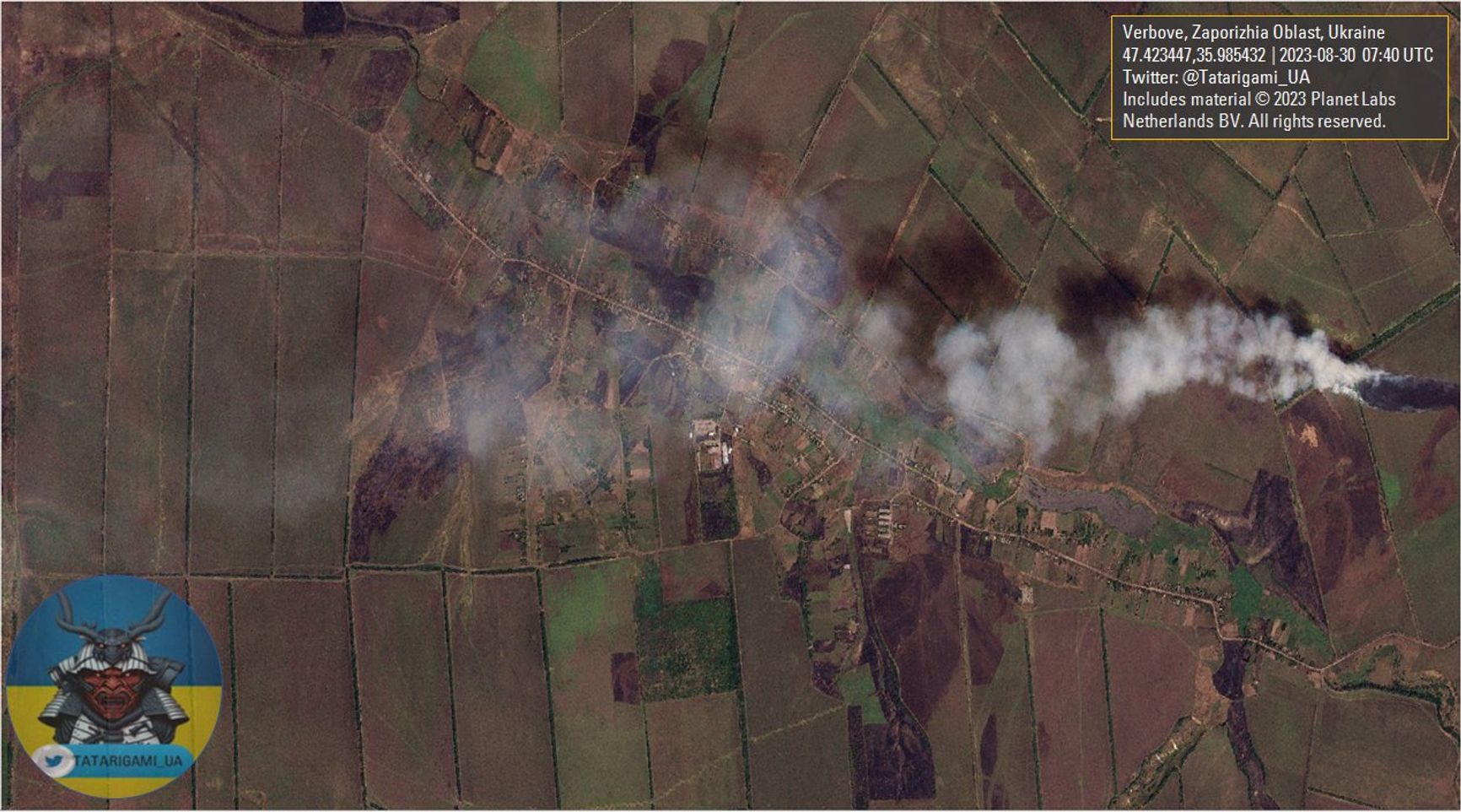 Офицер ВСУ, выступающий под ником Tatarigami_UA, публикует спутниковый снимок Вербового от 30 августа с явными признаками значительного огневого поражения.