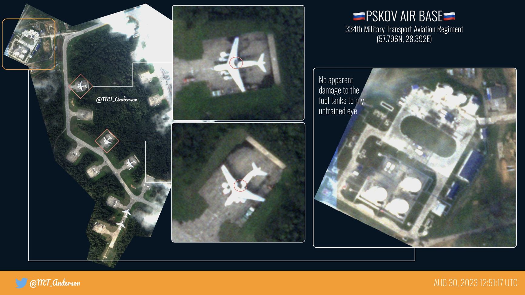 Исследователь MT Anderson также публикует спутниковые снимки аэропорта Пскова в оптическом диапазоне и констатирует, что на них нет видимых повреждений топливно-заправочного комплекса.