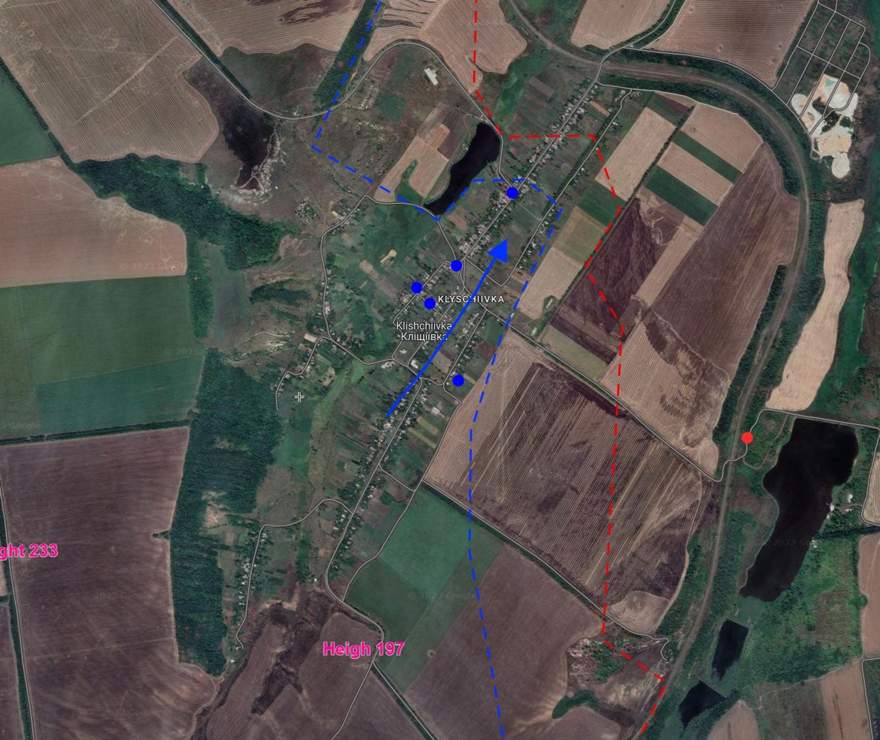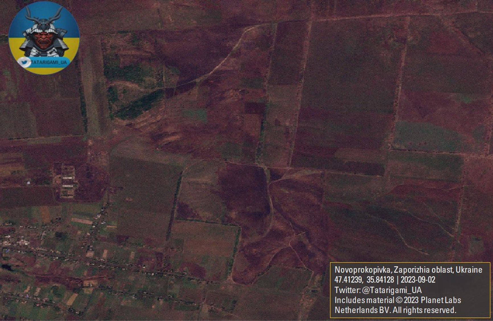 Офицер ВСУ, пишущий под псевдонимом Tatarigami_UA, публикует свежий спутниковый снимок окрестностей Новопрокоповки с явными признаками активных боевых действий (в виде следов артиллерийских ударов и открытого горения).
