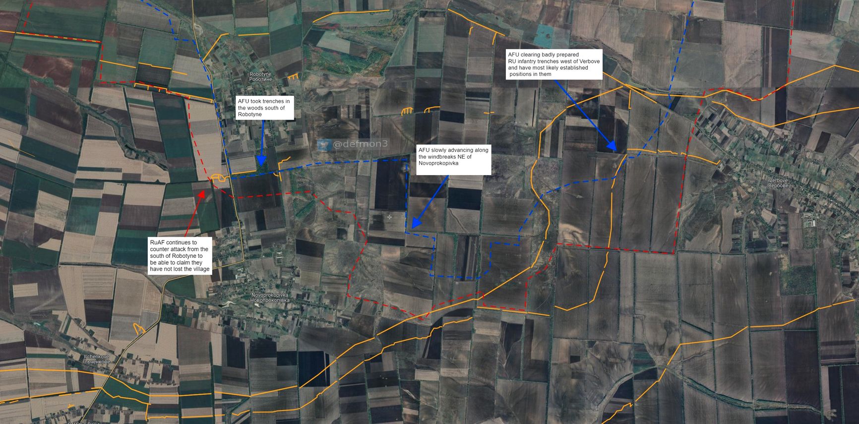 Впрочем, офицер ВСУ, пишущий под псевдонимом Tatarigami_UA, ставит под сомнение какие-либо крупные попытки контратак с российской стороны на основе анализа спутниковых снимков в указанном районе.