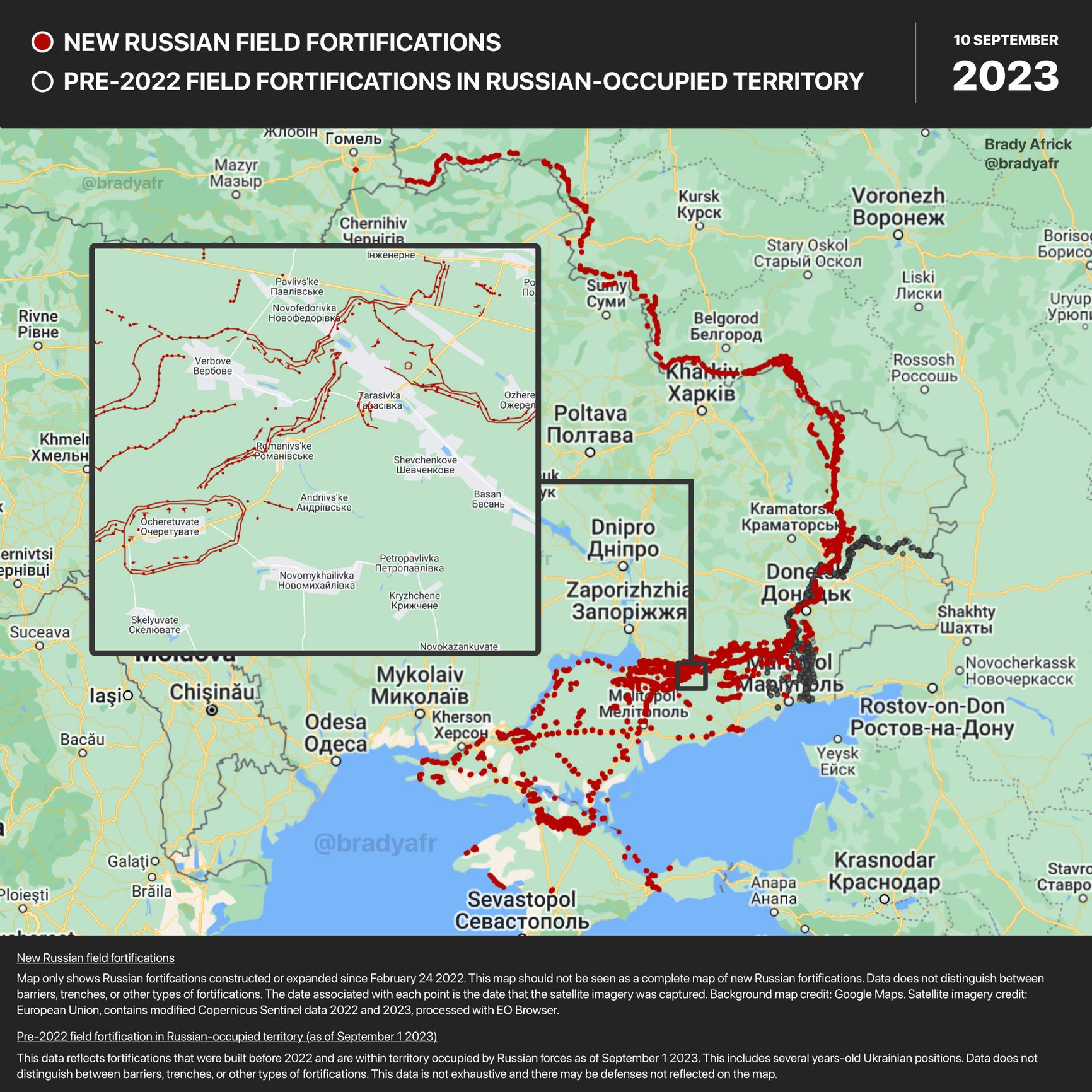 ВС РФ создают дополнительные оборонительные сооружения в Запорожской и Донецкой областях. Предыдущие были построены в конце 2022 и начале 2023 года.