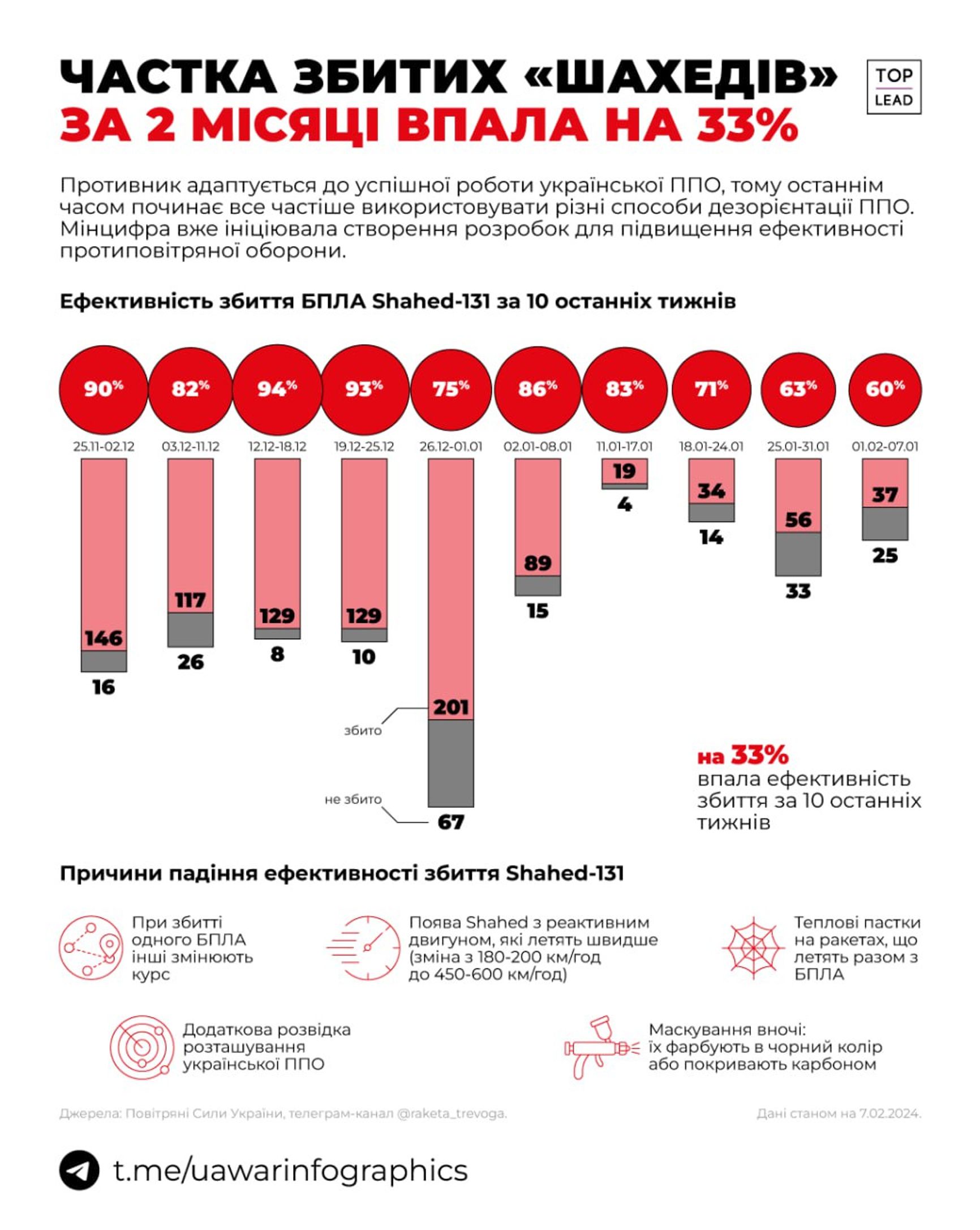 Данные, собранные проектом UA War Infographics, показывают, что если раньше украинские средства ПВО сбивали около 90% «Шахедов», то теперь — только 60%. Причина — лучшая маскировка дронов и нехватка систем ПВО.