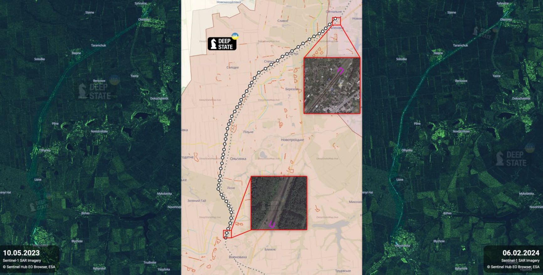 ВС РФ создали из более чем 2100 товарных вагонов состав длиной около 30 км. Он тянется от Оленовки до Волновахи в Донецкой области. Он не предназначен для перевозки чего-либо и служит, как пишет DeepState, в качестве вероятного дополнительного рубежа обороны.