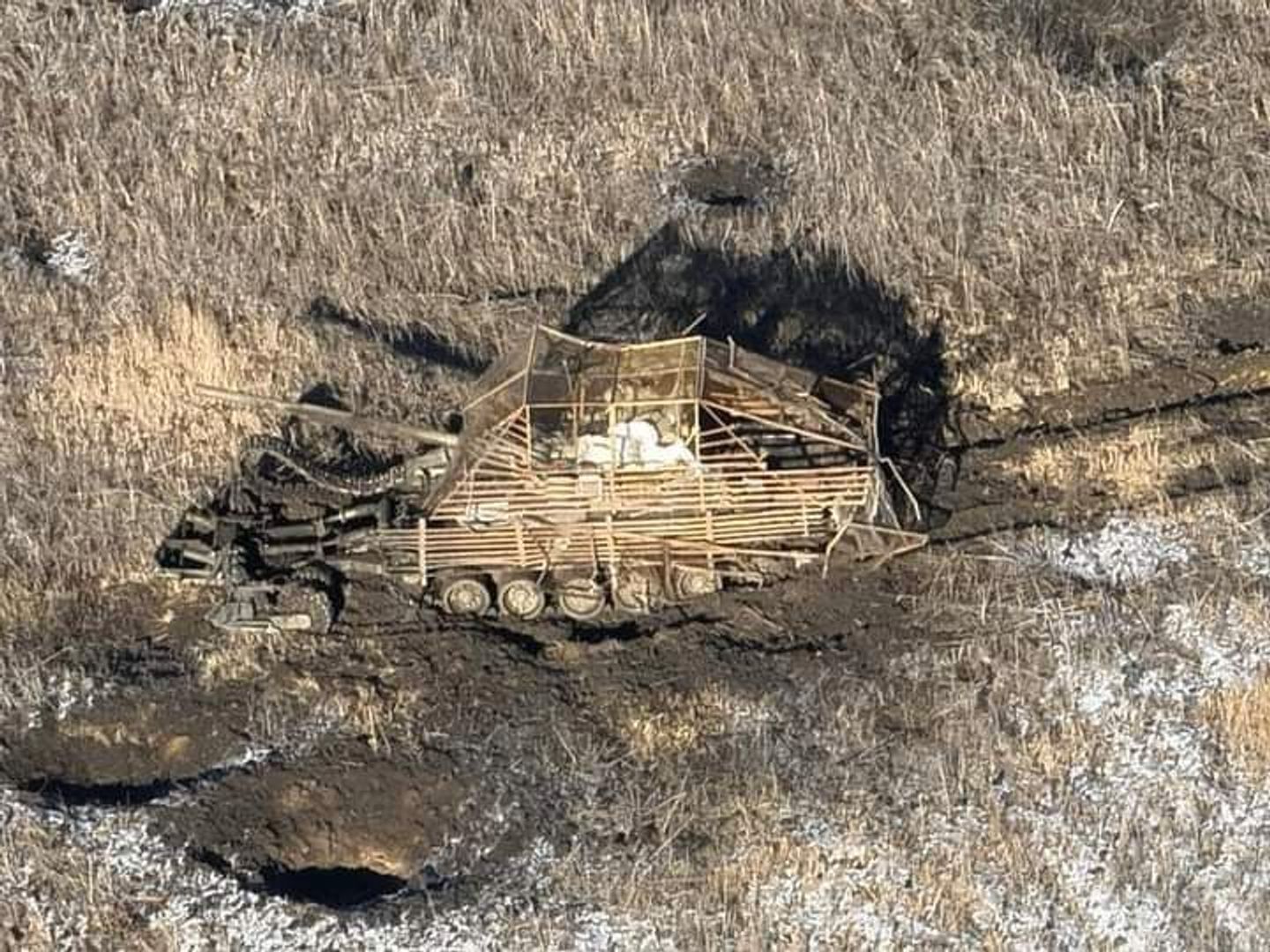 Украинский военный эксперт Андрей Тарасенко публикует фотографии российского танка Т-80БВ, который подорвался на минах. Он отмечает наличие на боевой машине дополнительных металлических пластин и сплошной обвес башни.
