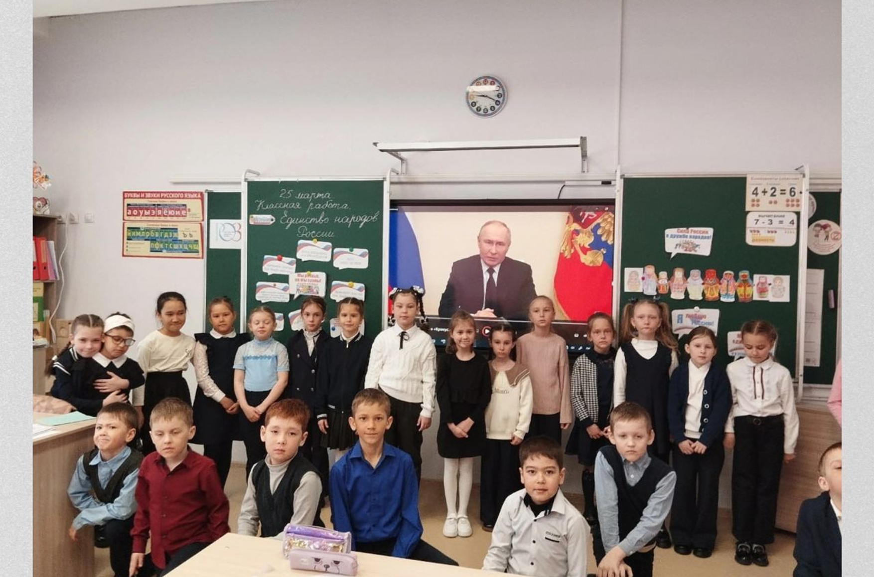 Часть урока посвятили просмотру обращения Владимира Путина после теракта. Согласно учебной программе, оно «способствует снижению эмоциональной напряженности и дает детям опору в стрессовой ситуации».