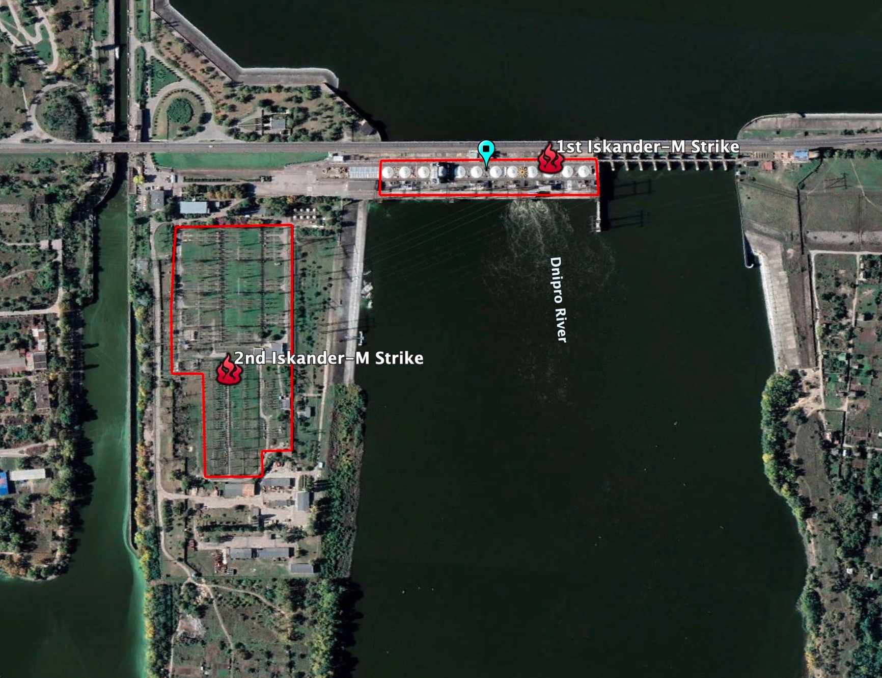 Видео удара по Кременчугской ГЭС публикует Telegram-канал «Повёрнутые на Z войне». Геолокацию атаки подтверждает ресурс Ukraine Battle Map. По его информации, одна ракета «Искандер-М» поразила генератор на плотине, а вторая — подстанцию и линии электропередачи.