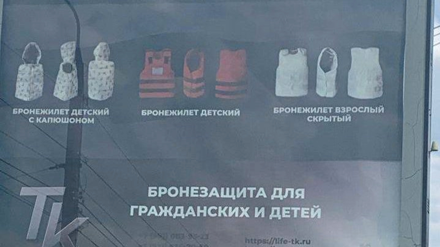 В Белгороде появилась реклама средств защиты для гражданских лиц, в том числе детей. 13 апреля фотографию рекламного щита компании «ТК-Жизнь» разместил Telegram-канал «Аполитичность губит», позднее она широко распространилась в СМИ и соцсетях.