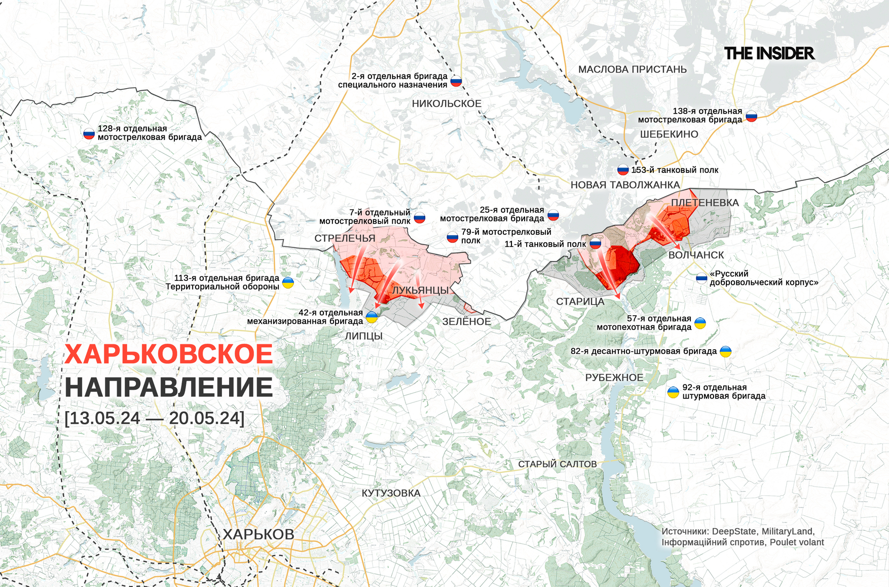 По данным DeepState, российским войскам на харьковском направлении удалось продвинуться в Зелёном (на фланге, обращенном к собственно Харькову) и в районе Бугроватки (западнее Волчанска). «Военкор» Юрий Котенок пишет, что ВС РФ и ВСУ в Волчанске разделяет только река Волчья, из-за чего россияне до сих пор не могут захватить город, но независимых подтверждений этому нет.