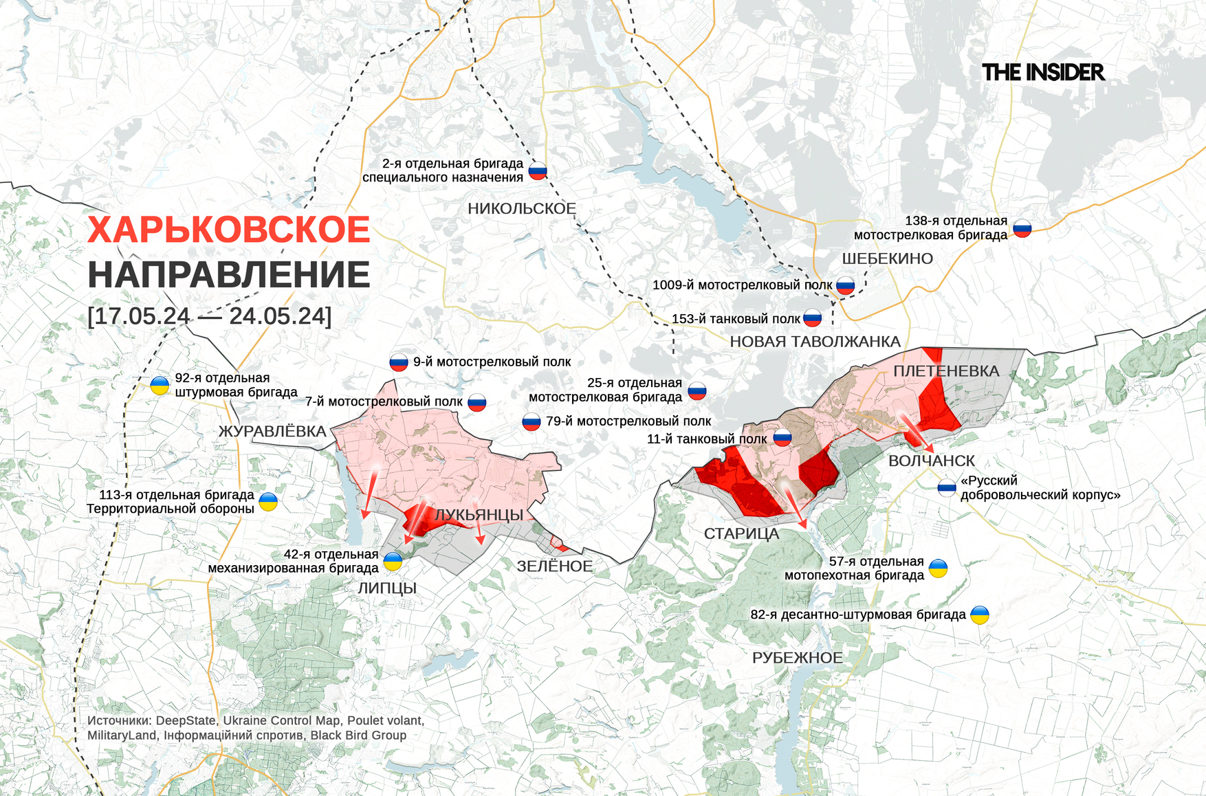 DeepState сообщает о продвижении ВС РФ рядом с Очеретино в авдеевском операционном районе, отмечаются бои в Волчанске на севере Харьковской области и Берестовом к юго-востоку от Купянска, а также в Клещеевке (южнее Бахмута), Уманском (в центре полосы наступления от Авдеевки) и Красногоровке (севернее Марьинки).