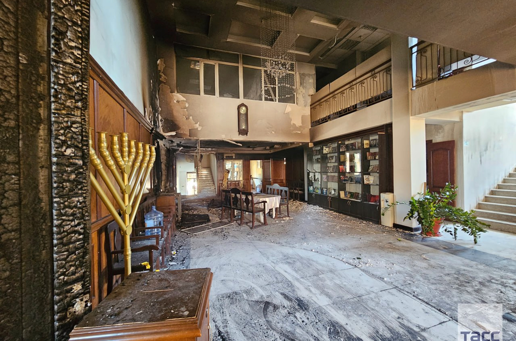 Примерно в то же время, когда было совершено нападение на церковь, в 18:30, другие неизвестные бросили коктейль Молотова в махачкалинскую синагогу на улице Ермошкина. На дверях здания они оставили указатели на суры и аяты из Корана. Синагога находится на той же улице, что и пост ДПС, поэтому сразу после нападения на нее началась перестрелка с полицией — боевики расстреляли машины с полицейскими.