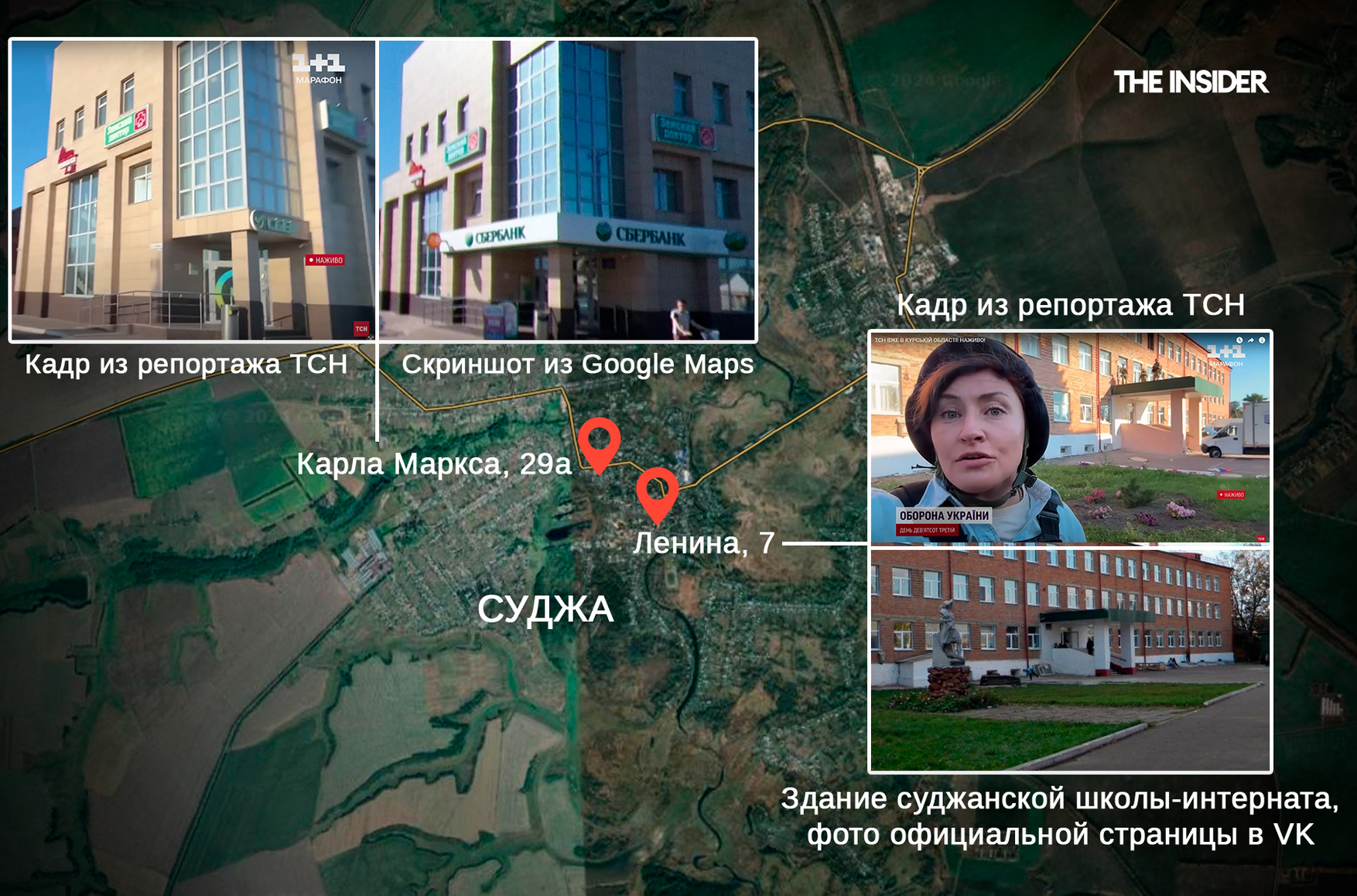 На одном из кадров группа проезжает мимо здания на улице Карла Маркса в городе Судже. На другом — украинские военные снимают российский флаг со здания школы-интерната, а ведущая телеканала в эфире называет это историческим моментом.