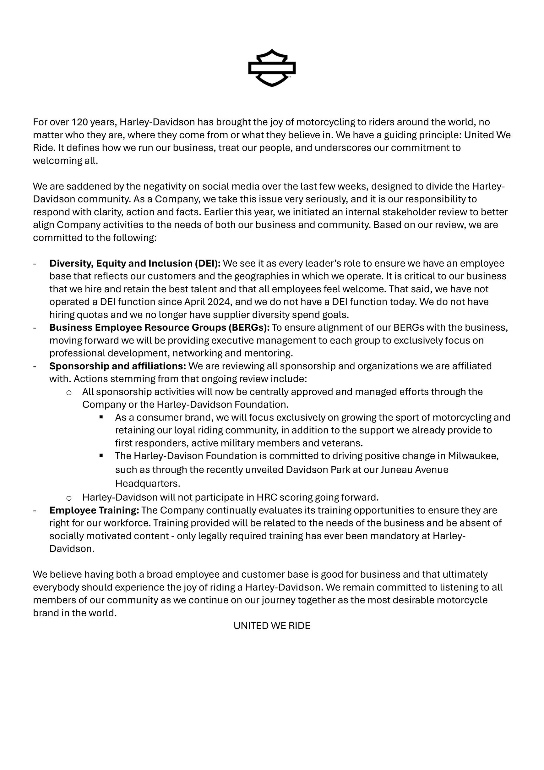 Американский производитель мотоциклов Harley-Davidson объявил, что в компании больше нет программы по обеспечению представленности национальных меньшинств, равноправия и инклюзивности (diversity, equity, inclusion — DEI). Кроме того, компания сообщила о планах по пересмотру партнерских и спонсорских соглашений. В частности, производитель мотоциклов перестанет сотрудничать с организацией Human Rights Campaign, активно выступающей за защиту прав ЛГБТ-людей.