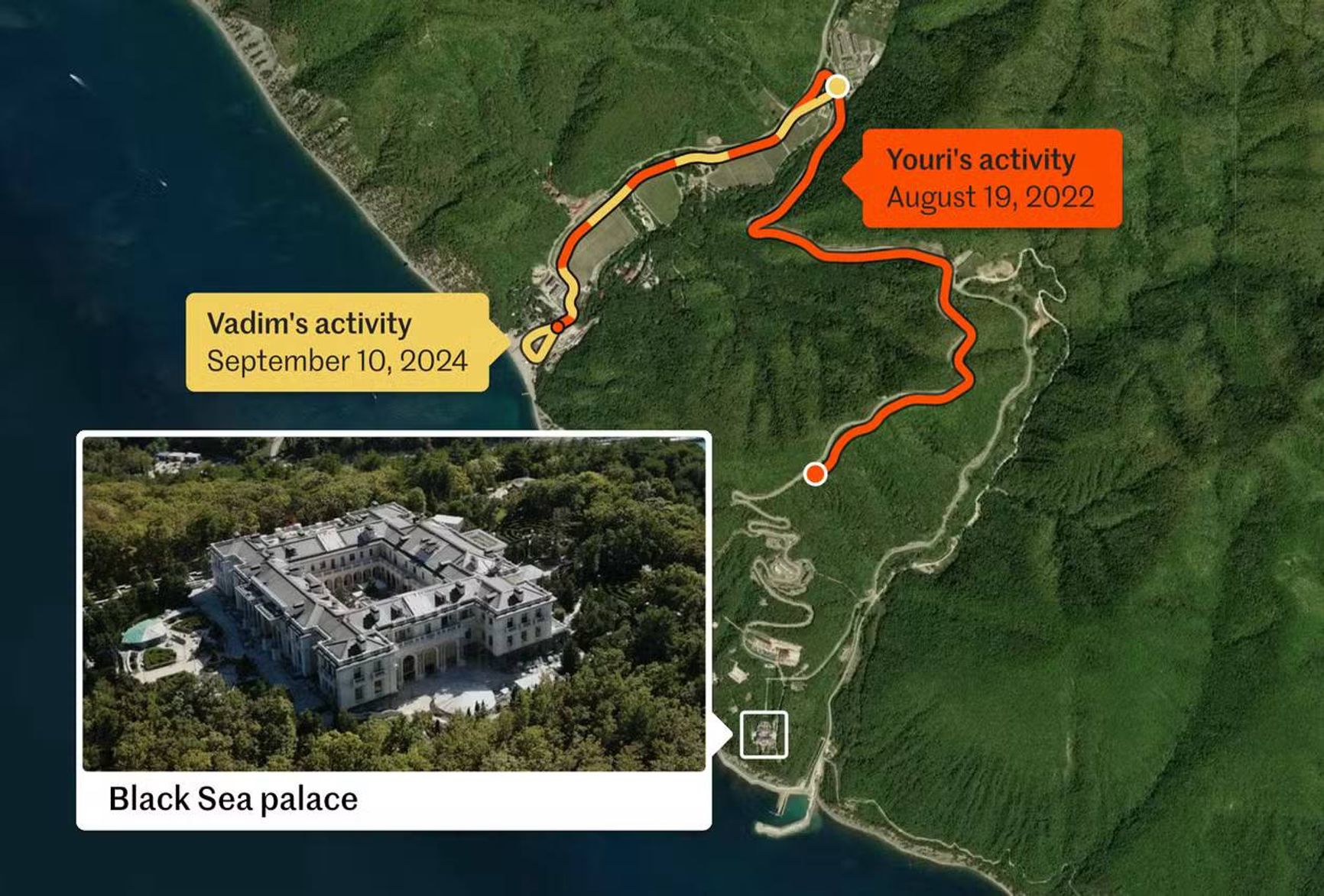Также стало известно, что несколько охранников Путина в разные годы занимались спортом возле его «дворца» в Геленджике, владение которым президент РФ отрицает. Четверо из них находились в радиусе 15 километров от гигантского черноморского дворца в 2019, 2021, 2023 и 2024 годах соответственно. Все — в одно и то же время года: с 19 августа по 22 сентября.