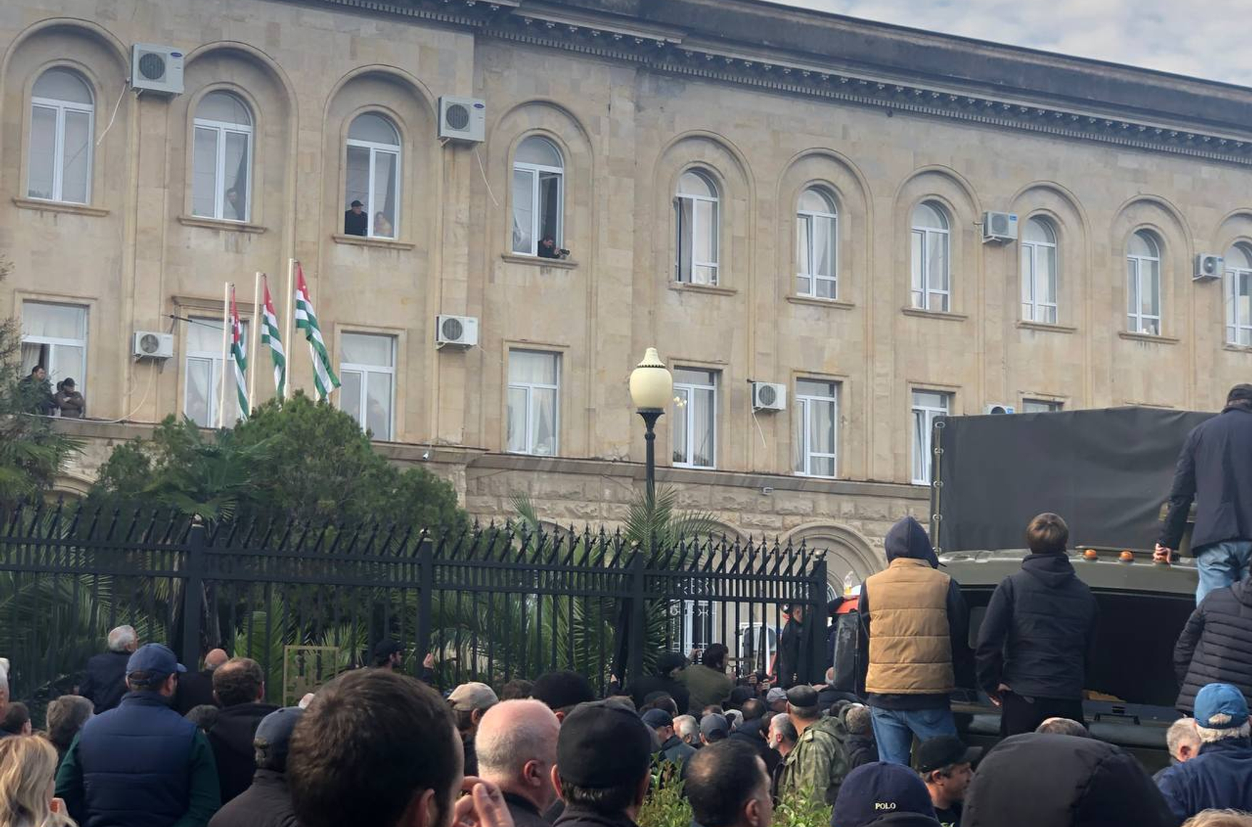 У здания парламента Абхазии произошли столкновения между сторонниками оппозиции и силовиками, охраняющими здание Народного собрания. Как сообщает «Интерфакс», участники акции протеста протаранили часть ограждения с помощью грузового автомобиля и проникли на территорию переднего двора парламента.