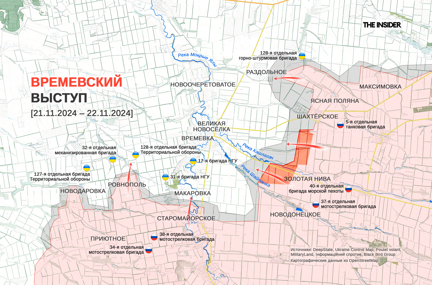 «Военкор» Юрий Котенок утверждает, что около Великой Новосёлки российским войскам удалось прорвать оборону ВСУ и установить огневой контроль над важной с точки зрения снабжения трассой. На восточном фланге Времевского выступа в районе Раздольного ВС РФ угрожают выйти противнику в тыл в обход основных оборонительных позиций.