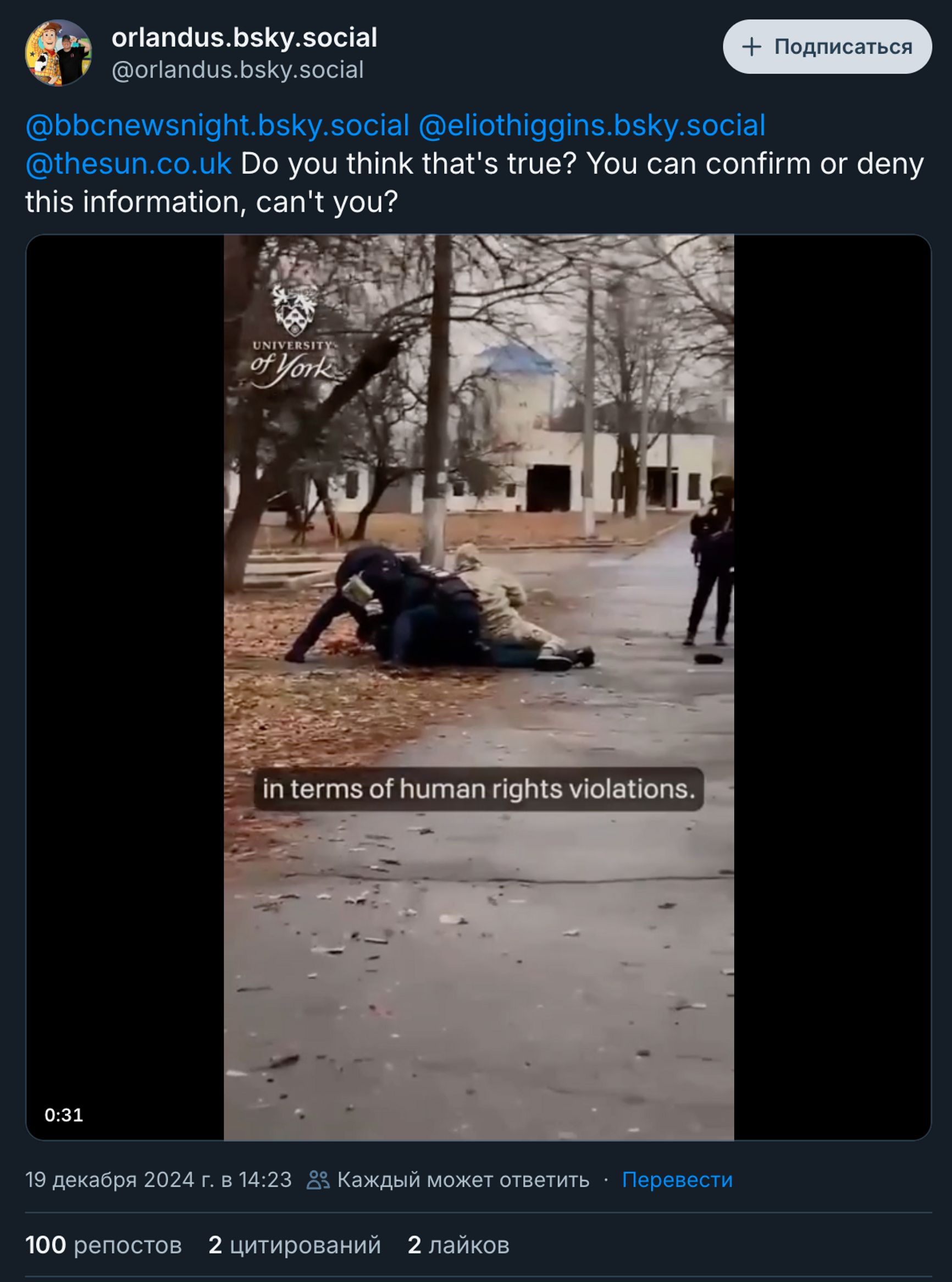 Видеозаписи публикуются с сопутствующими фразами «Это правда?!» или «Вы можете подтвердить информацию?», к этому добавляются теги известных фактчекеров. Затем его репостят сотни других аккаунтов. Точнее, сотнями исчисление идет в Twitter (Х), в более молодом Bluesky на этих публикациях репостов мало — самый «распространившийся» ролик получил 288 репостов, а другой — всего четыре.