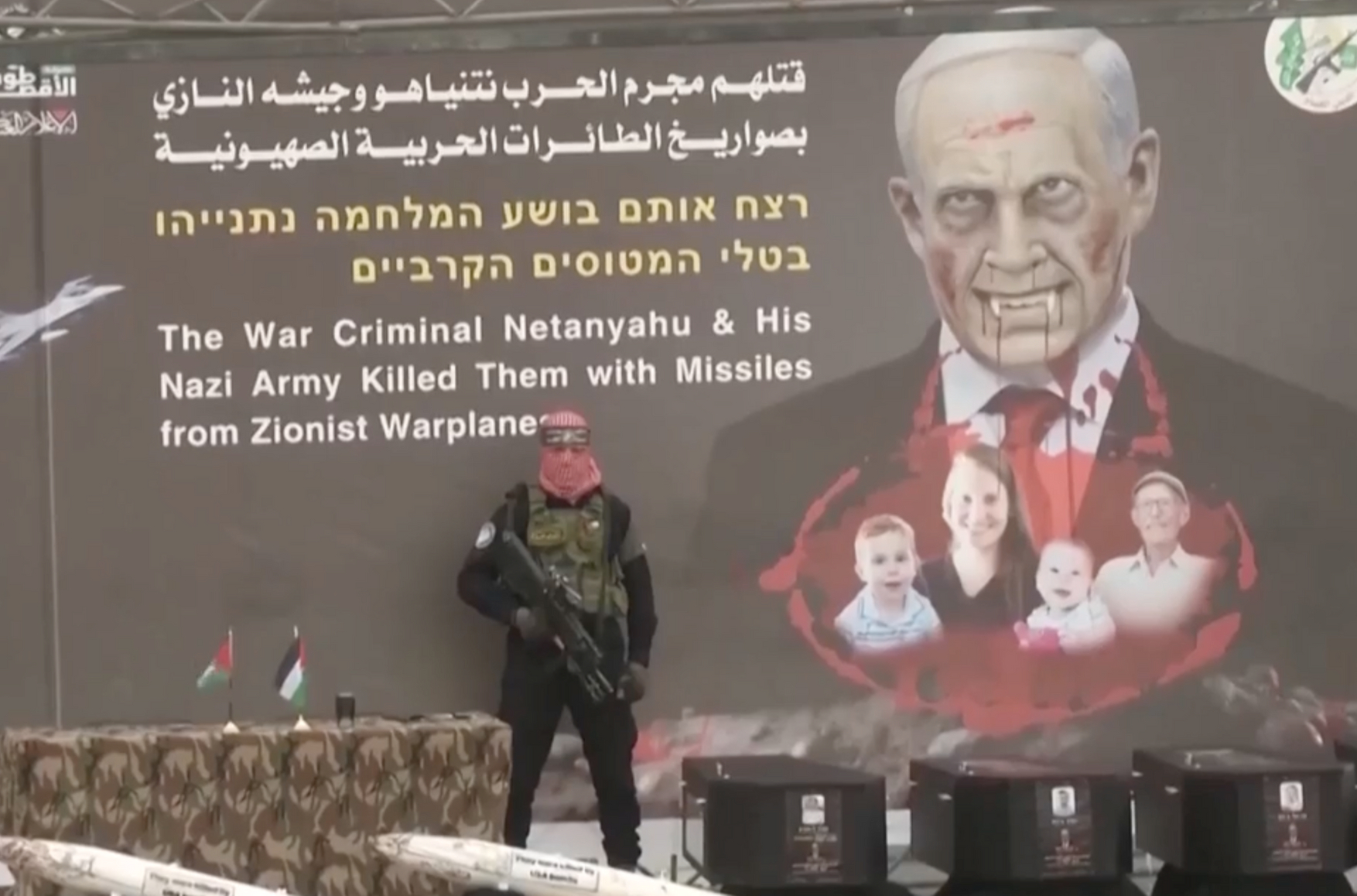 ХАМАС сопроводил передачу тел пропагандистской акцией, установив сцену с плакатами, где были размещены фотографии погибших заложников. Боевики также вывесили изображение премьер-министра Израиля Биньямина Нетаньяху в образе вампира и выставили гробы с израильскими флагами, сопроводив их обвинительными слоганами в адрес израильского руководства.