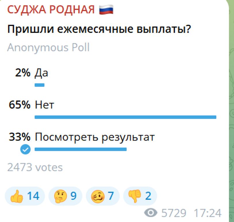 Как рассказал The Insider один из местных жителей, новых выплат они пока не увидели. Еще в понедельник Хинштейн обещал начать выплаты «на этой неделе», а по закону сформировать базу данных получателей помощи специальное учреждение «Центр социальных выплат», подконтрольное региональному Минсоцобеспечения, должно не позднее 28 февраля. После этого на счета учреждения должны поступить деньги, которые отправятся на счета получателей в течение 5 рабочих дней. Судя по результатам опроса в местном Telegram-канале «Суджа родная», в массовом порядке этого пока не произошло.