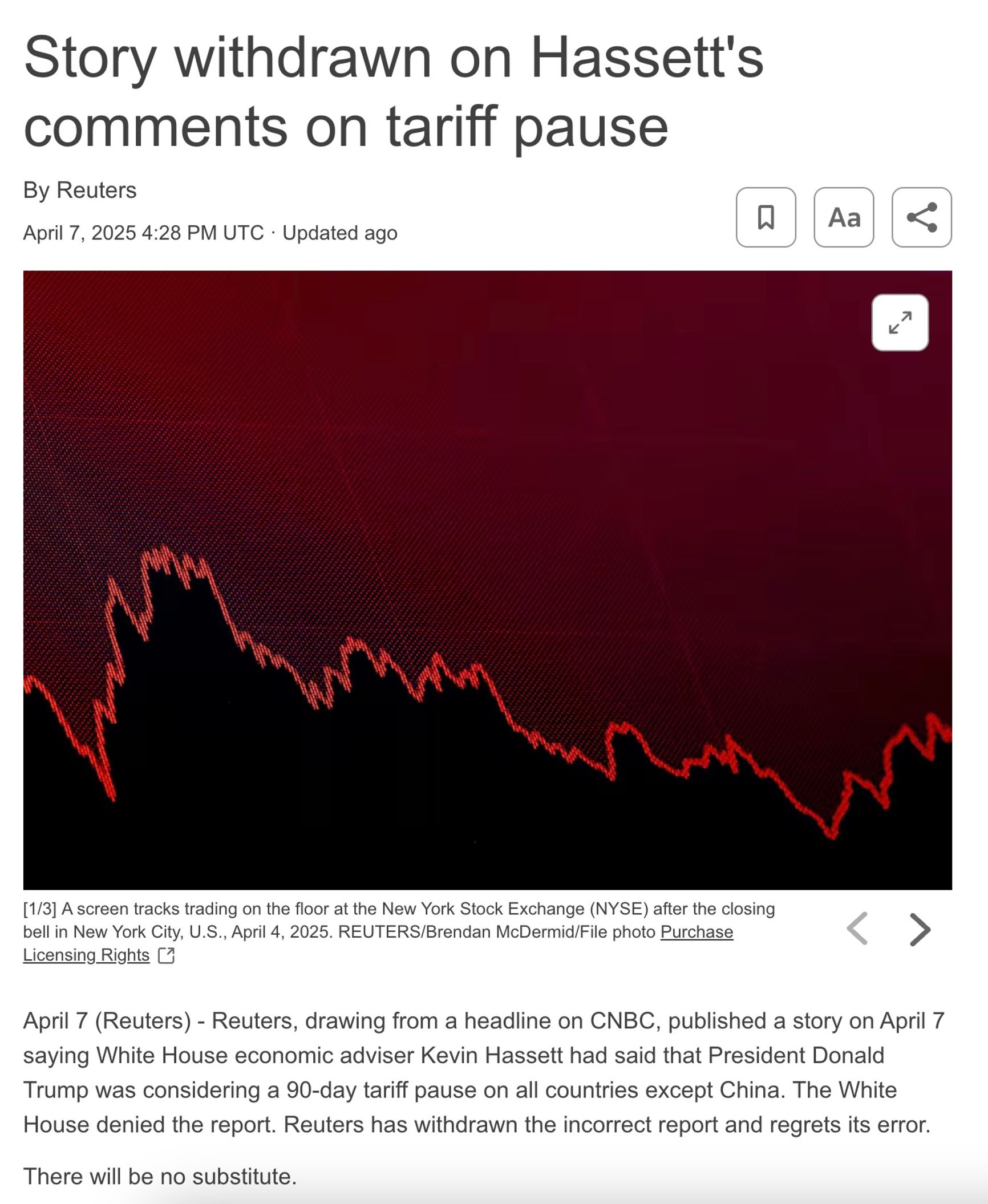 Reuters изменяет текст новостной статьи, убирает оттуда упоминание об «интервью» Хассета и отмечает, что в Белом доме сообщения о паузе назвали «фейком».