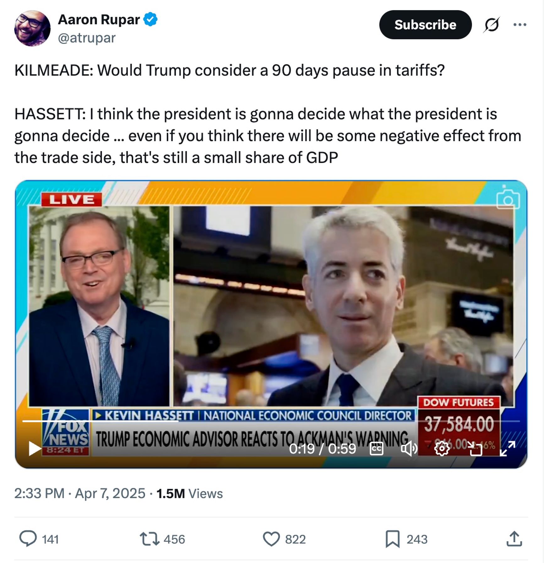 Кевин Хассет, глава Национального экономического совета при Белом доме, выступает на телеканале Fox News. Ведущий спрашивает его, будет ли 90-дневная пауза перед введением тарифов. Хассет отвечает, что «президент решит так, как он решит». «Более 50 стран ведут переговоры с президентом [США], сегодня приезжает премьер-министр Израиля, ночью с нами связывались из Тайваня», — продолжает он. В это время на экране показывают портрет Билла Экмана с бегущей строкой, в которой утверждается, что Хассет комментирует предупреждения предпринимателя.