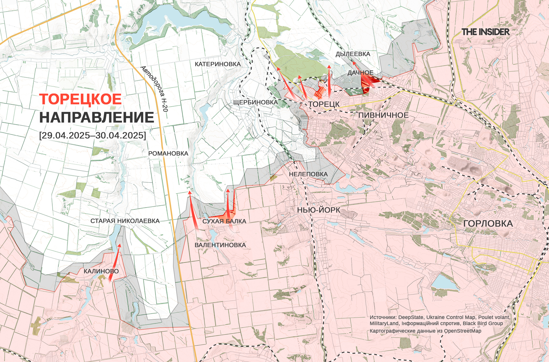 Аналитики DeepState пишут, что ВС РФ захватили Сухую Балку, продвинулись в жилой застройке на севере Торецка и в пригороде Дачном. «Военкор» Анатолий Радов утверждает, что село Дачное северо-восточнее Торецка находится под контролем ВС РФ, откуда готовится наступление на север в сторону двух населенных пунктов с названием Дылеевка (села и поселка).