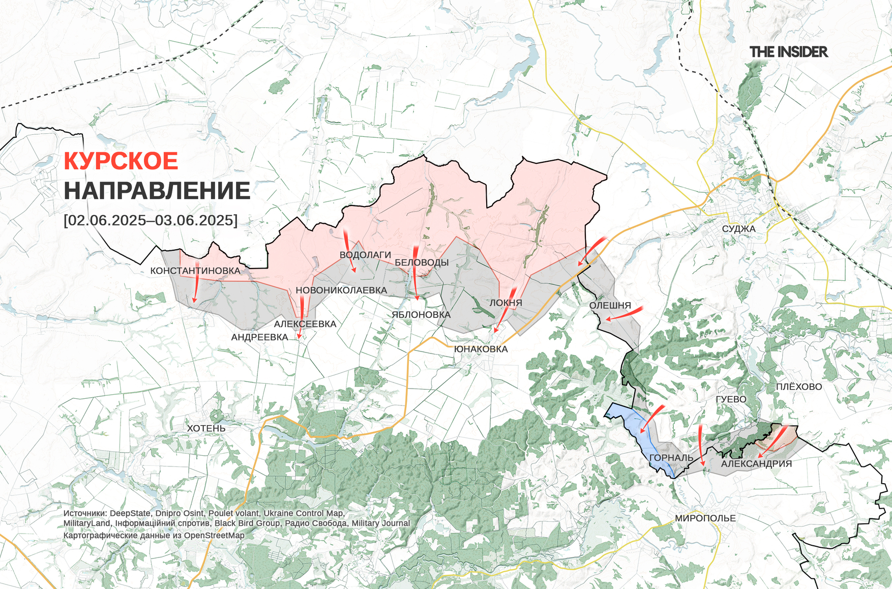 Между тем «военкор» Юрий Котенок пишет, что российские войска захватили Александрию и зашли в Мирополье. Также он сообщает о продвижении в Юнаковке и на подступах к Яблоновке, захвате основной части Новониколаевки и успешном штурме Андреевки.