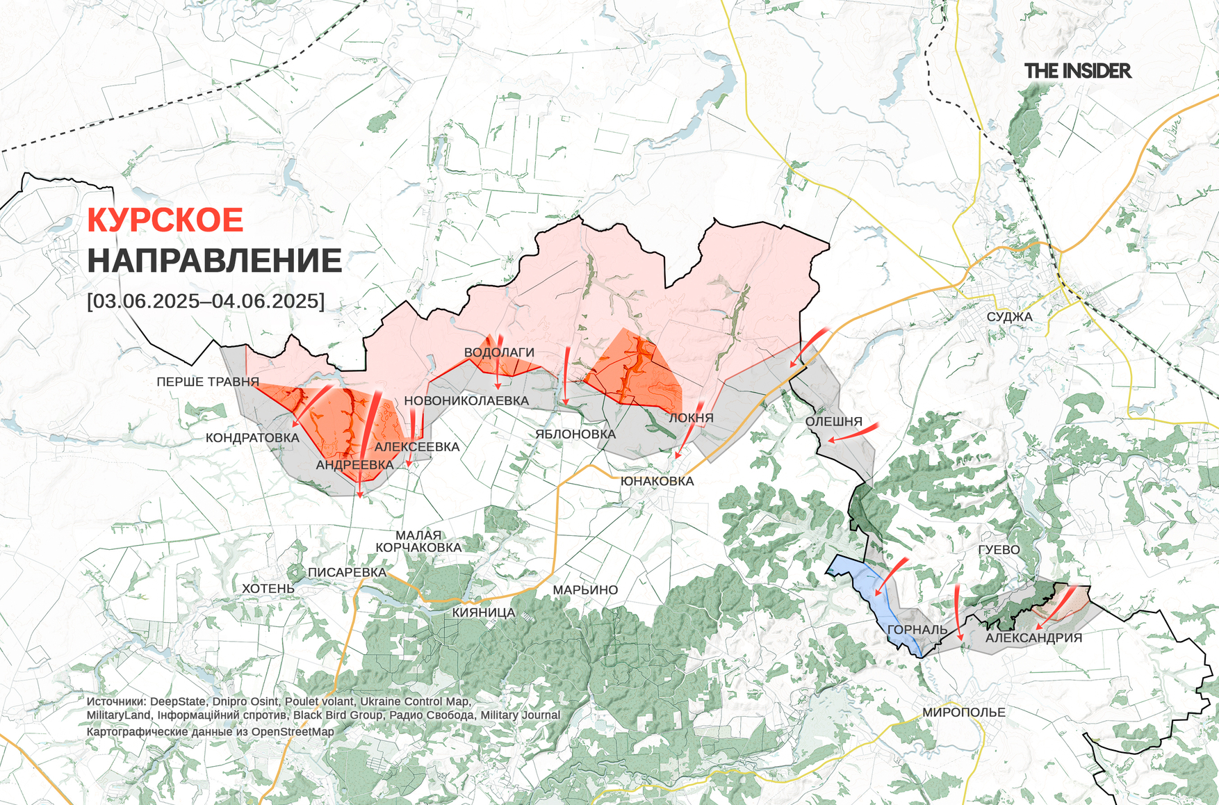 Аналитики DeepState пишут, что ВС РФ продолжают наступление в Сумской области, заняв села Андреевка и Водолаги, а также частично захватив северную часть Алексеевки. Российские войска массированно используют пехоту для продвижения, создавая угрозу на участке Яблоновка — Юнаковка и пытаясь закрепиться в Кондратовке. Аналитики предупреждают, что приближение на расстояние 20–25 км от Сум позволит запускать по городу FPV-дроны на оптоволоконном управлении.