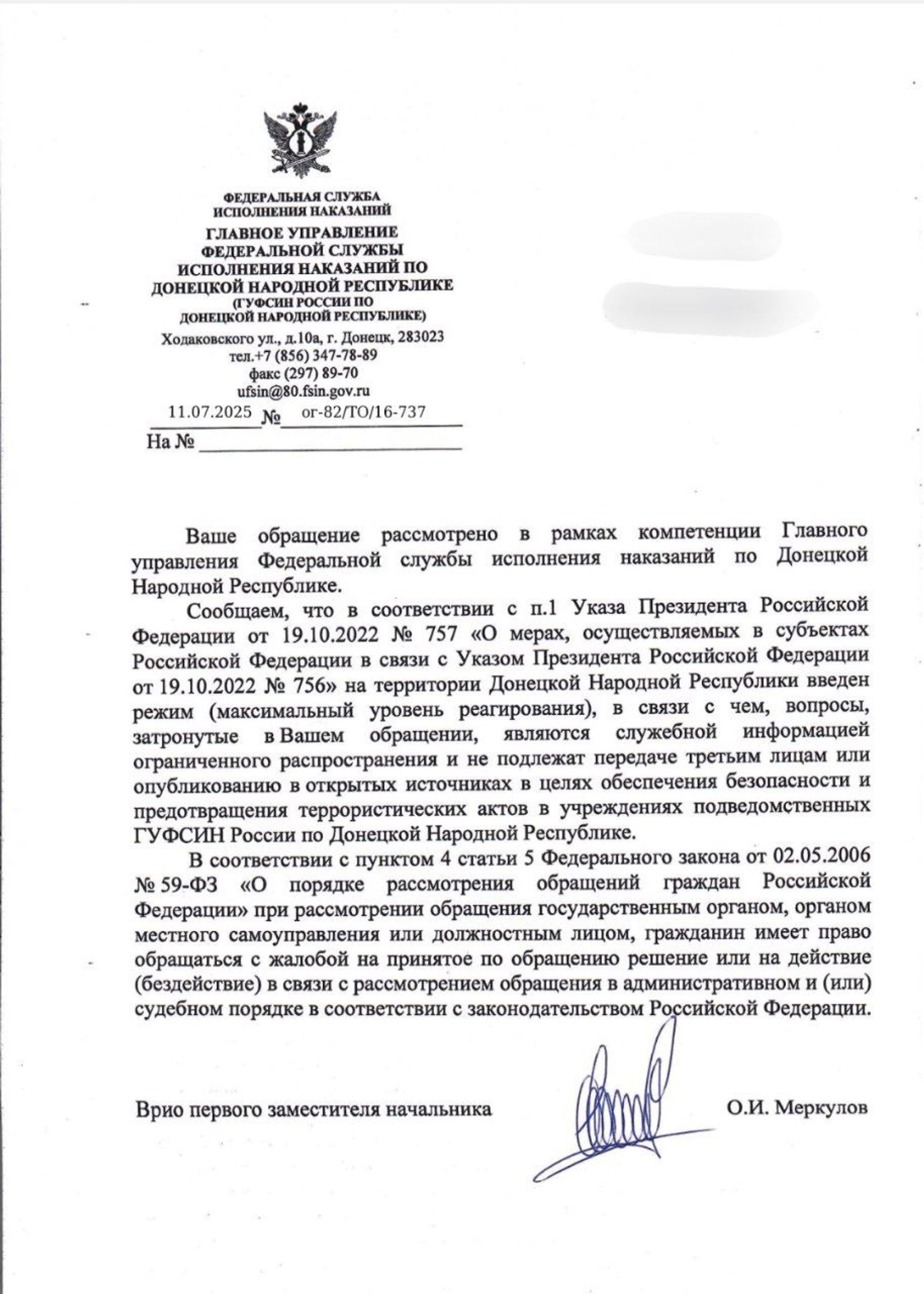 В запросе, отправленном в адрес ГУФСИН, была просьба пояснить, является ли ИК-1 в «ДНР» мужской или женской колонией и какого она режима — общего или строгого. В ответе, подписанном врио первого замначальника ГУФСИН по «ДНР» О.И. Меркуловым, сказано: