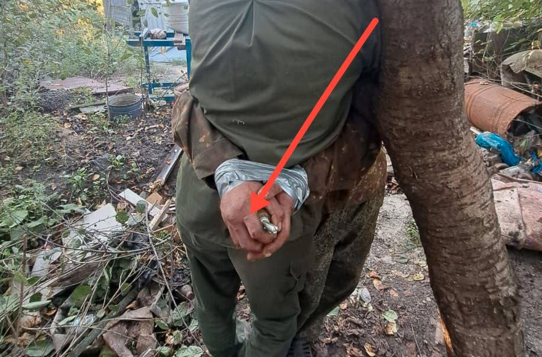 Z-«военкор» Александр Гармаев опубликовал фото, на котором двое, как заявляется, украинских военнопленных связаны друг с другом. Один из них держит гранату в руке. У ручной гранаты выдернули предохранительную чеку, взрыв произойдет, как только рука устанет держать спусковой рычаг.