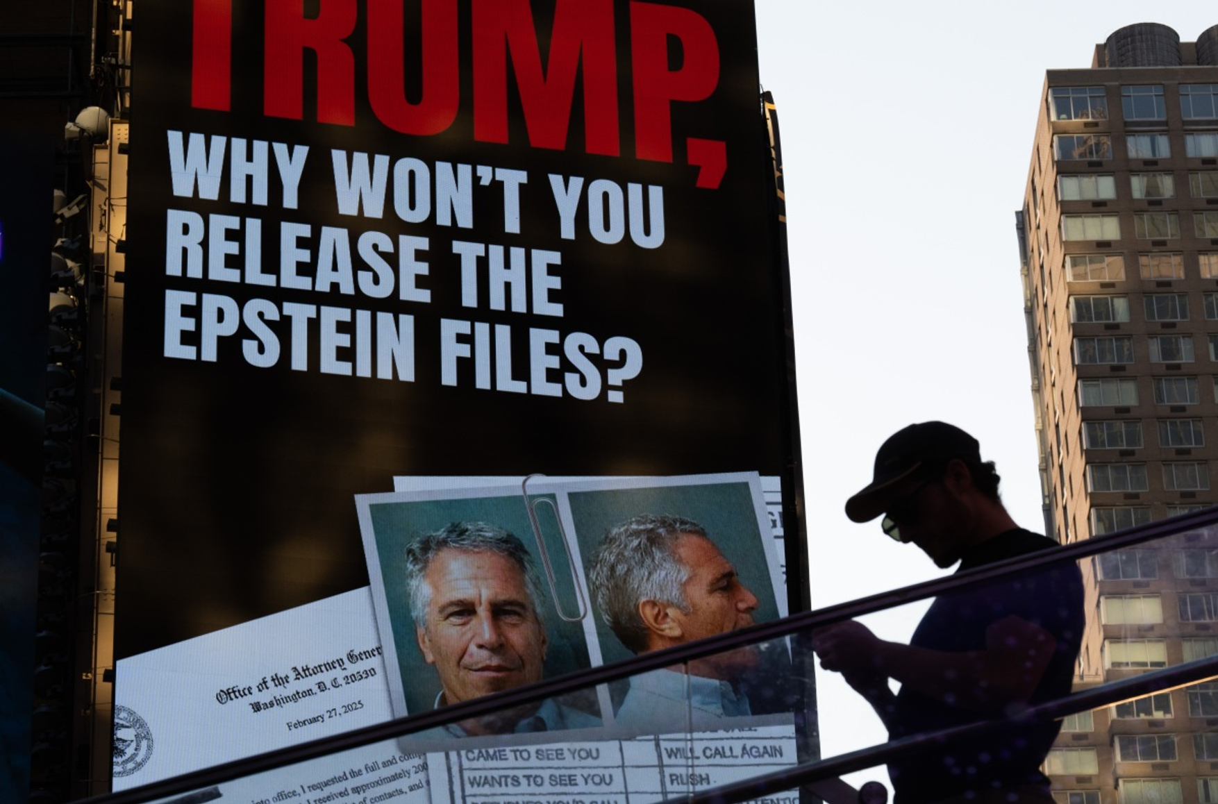 Фото: биллборд в Нью-Йорке с призывом к обнародованию файлов Эпштейна / Getty Images