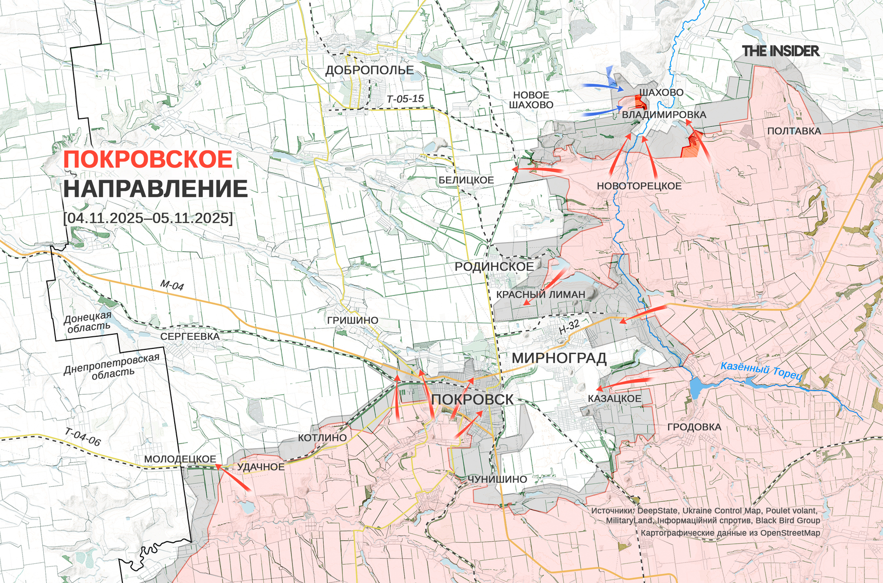 В DeepState сообщили о продвижении СОУ в районе Шахова (до 2016 года — Октябрьское) и ВС РФ в районе Владимировки у основания Добропольского выступа. Судя по карте проекта, украинские войска практически завершили ликвидацию «прорыва» в сторону Доброполья. Аналитики DeepState также обновили оценку ситуации в Покровске (до 2016 года — Красноармейск): по их сведениям, российские военные продолжают «просачиваться» в город и закрепляются на его южных окраинах. Несмотря на усилия по уничтожению просочившихся групп, момент для перекрытия путей проникновения в город с юга уже упущен, считают аналитики. По оценке украинского OSINT-ресурса «КАРТОГРАФ ✙ ЗСУ», по состоянию на утро 5 ноября 84% территории Покровска находились под контролем ВС РФ или в «серой зоне». За два дня с 3 ноября эта цифра увеличилась на 4%. По сведениям Анатолия Радова, украинские бойцы постепенно выходят из Покровска, а российские силы начинают зачистку южной части города.