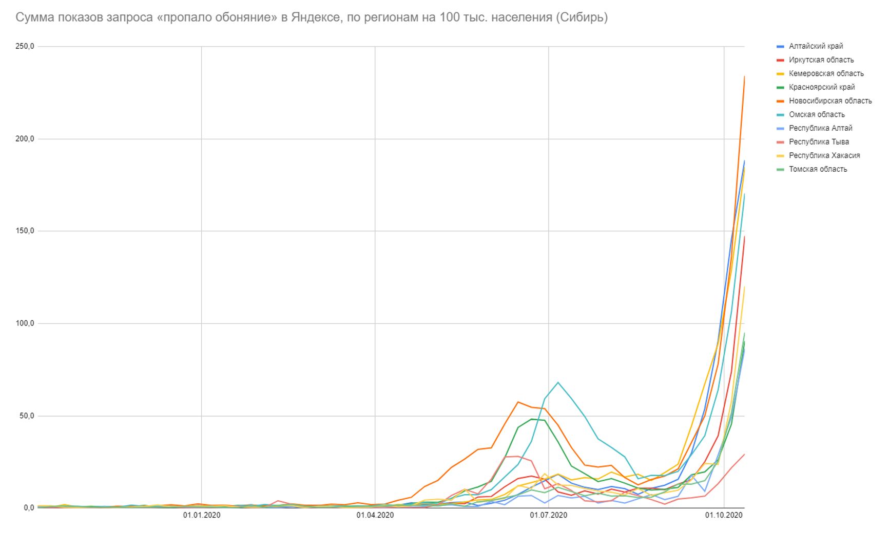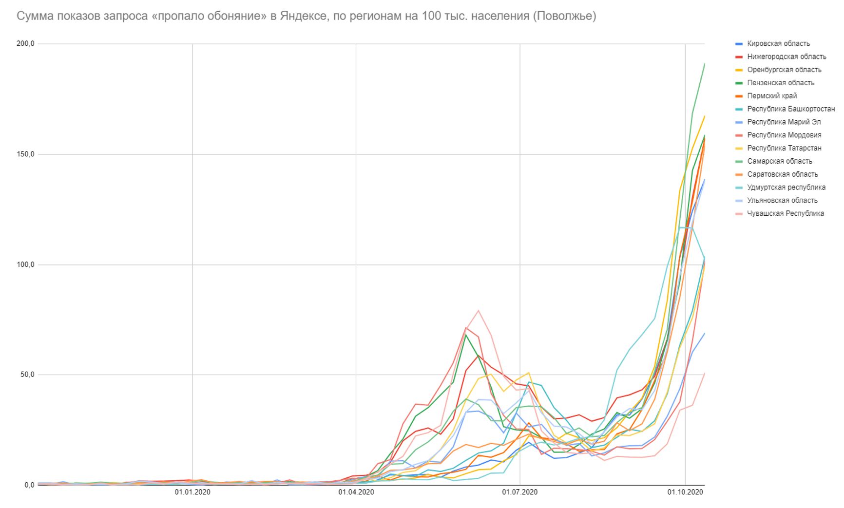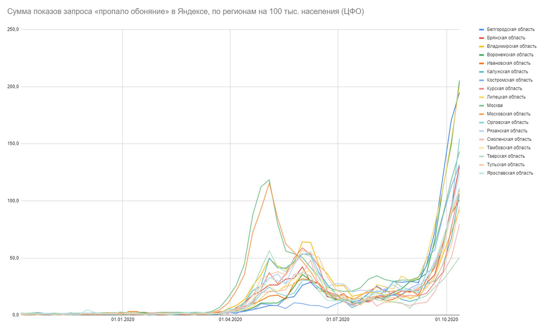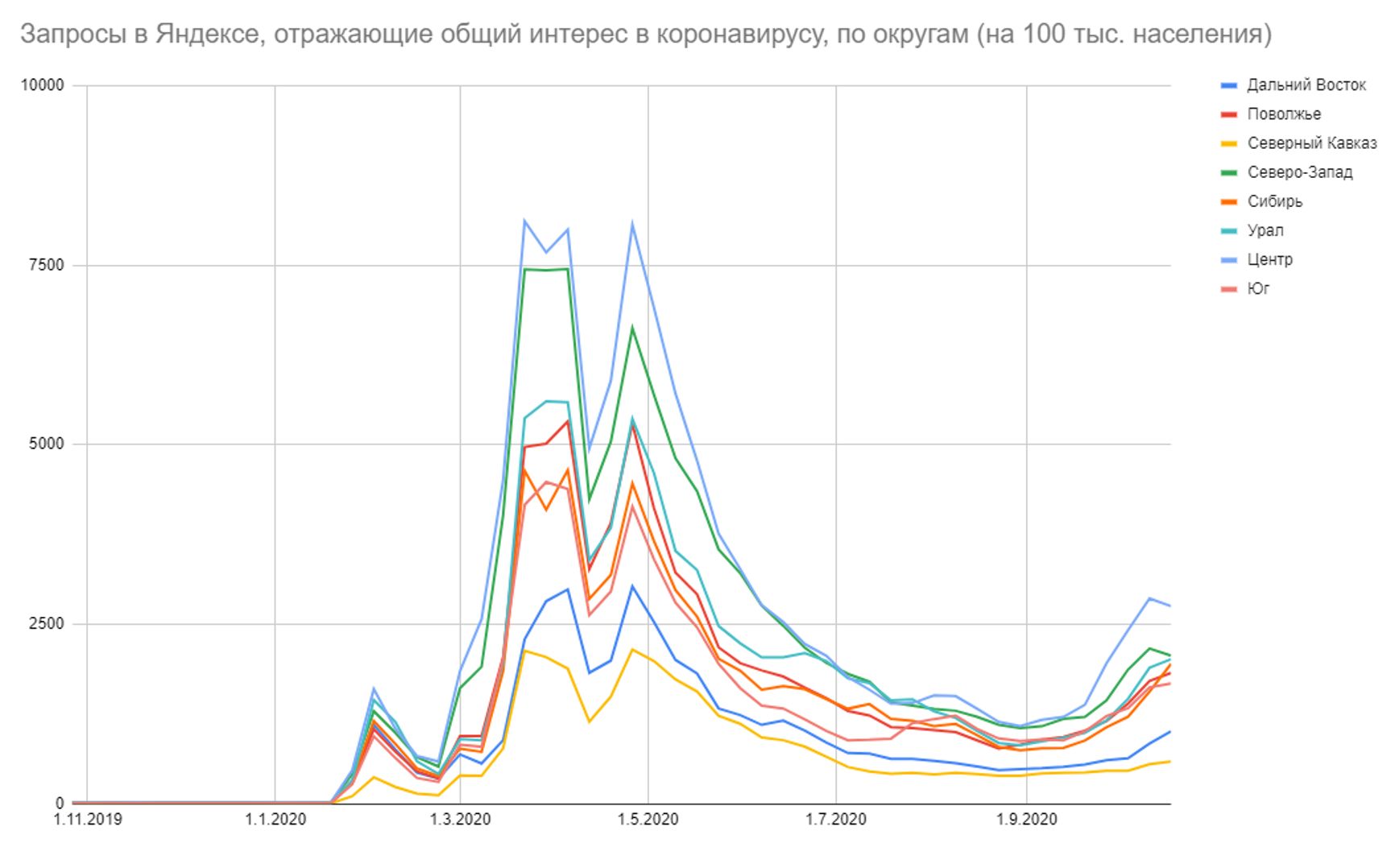 Если оценивать относительную долю показов (сколько % приходилось на конкретный запрос от всех запросов в Яндексе в регионе за период), картина ещё страшнее — в 6 регионах ситуация вдвое хуже, чем в Москве на майском пике, ещё в 3 — ситуациях втрое хуже, остальные регионы уже преодолели весенне-летние пики — и свои, и московский: