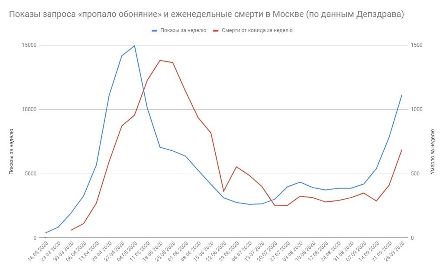 Как это выглядит на практике? Вот Москва. Сопоставление запросов и смертей за неделю. Здесь видно, как смерти следуют за запросами с двухнедельным сдвигом. А ещё видно, как с августа смерти перестают отражать динамику запросов.