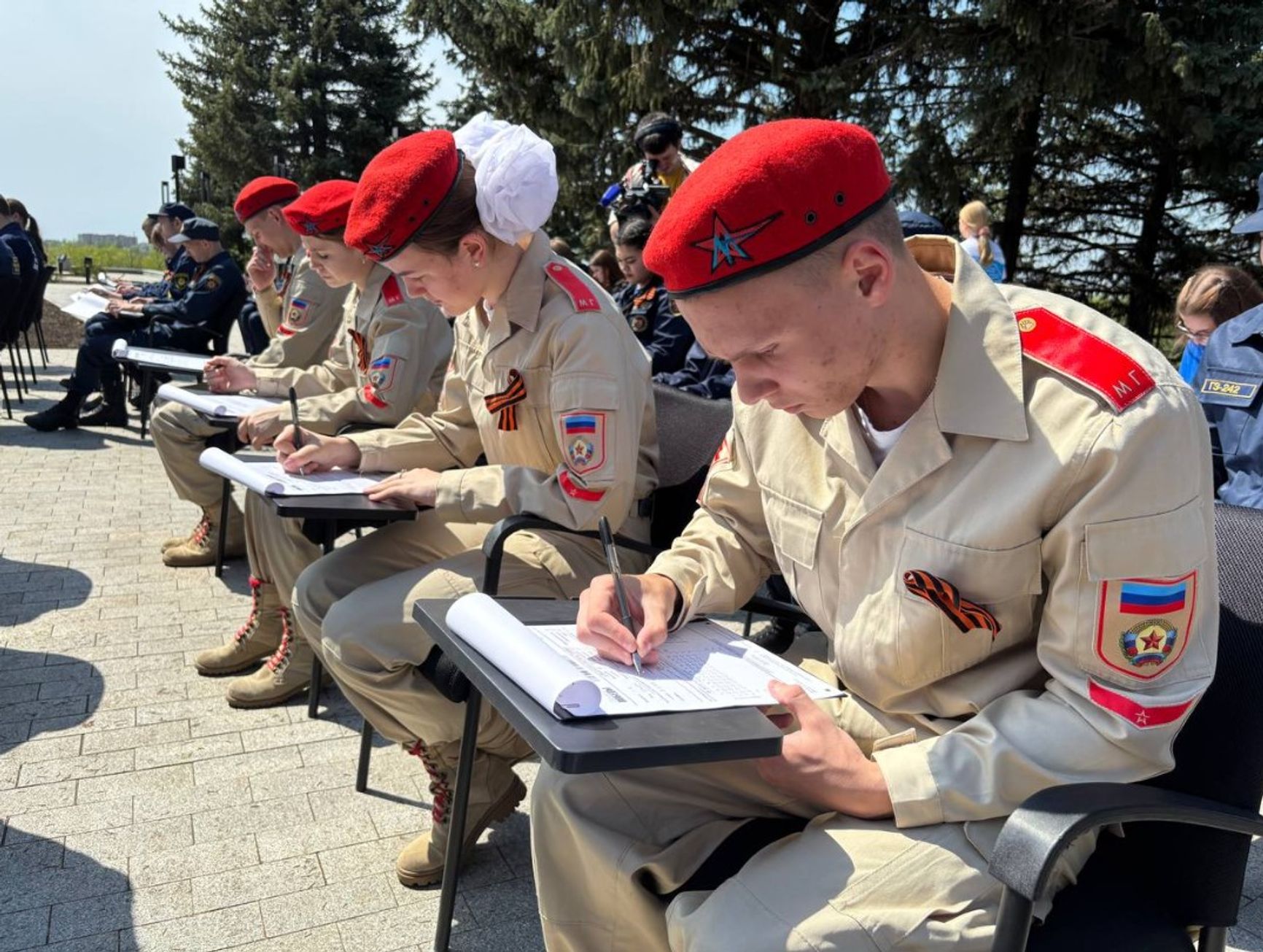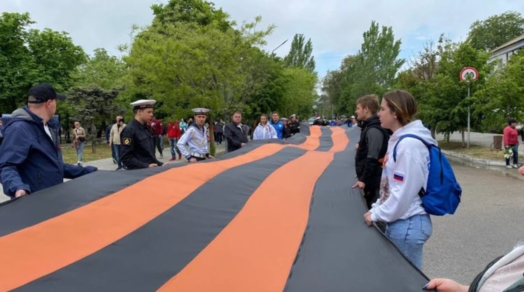 В рамках акции «Непокоренные» молодые дончане помогли российским военным и главе «ДНР» Денису Пушилину растянуть «самую большую в мире копию Знамени Победы». Ради безопасности «главы» в тот день военные перекрыли доступ к монументу другим детям и родителям, заставив их стоять в километровой очереди много часов и требуя пропуска.