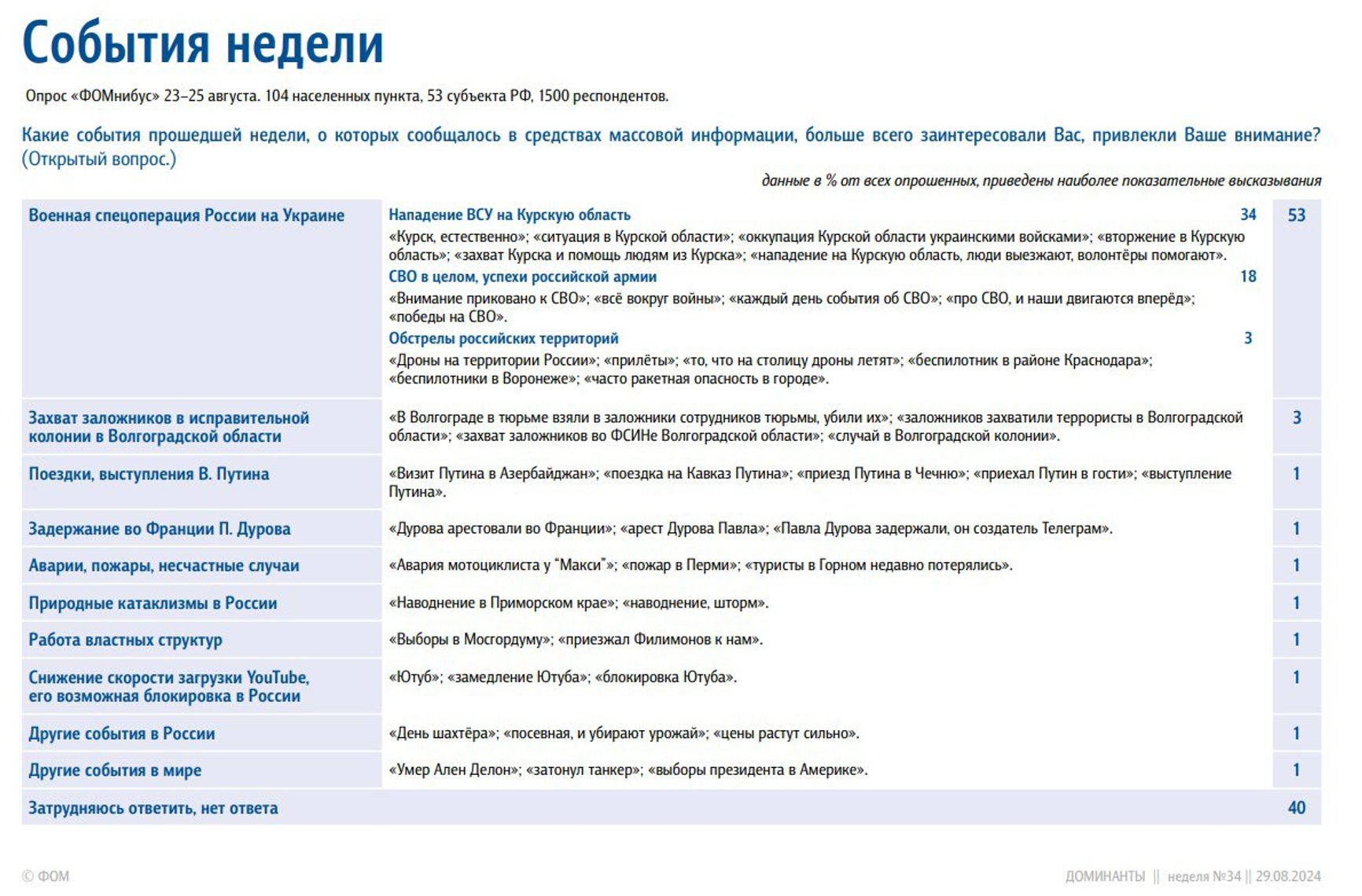 У «Левады» в рейтинге событий августа Курск на первом месте с 40%, а «СВО» (война, Украина) в целом — 12%. Данные за сентябрь еще не опубликованы.