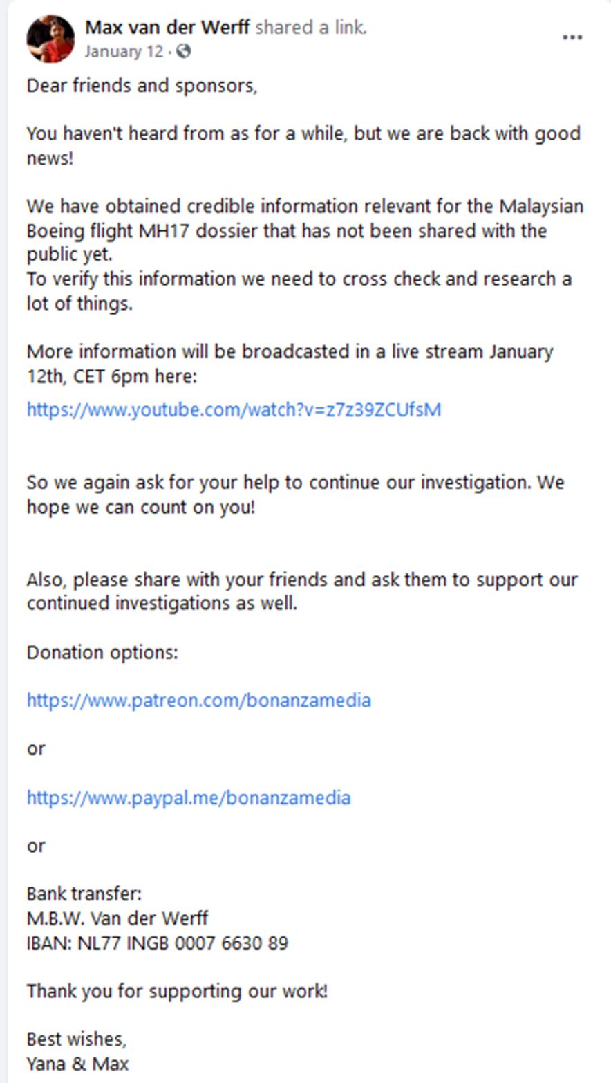 В 6 часов утра по московскому времени 12 января 2020 года Макс ван дер Верфф разместил в Facebook пост о том, что он получил «заслуживающую доверия информацию» о сбитом «Боинге», которая требует дополнительной проверки, опубликовал реквизиты для желающих его поддержать и проанонсировал стрим, на котором обещал рассказать подробности.