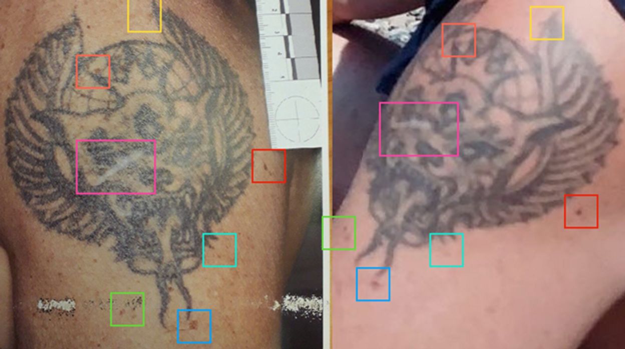 Но главное — на одном из этих фото, где Красиков сидит на пляже в бейсболке и майке, видна большая татуировка на его левом плече, и она полностью идентична татуировке, обнаруженной на плече «Вадима Соколова» и сфотографированной полицейскими (ранее это фото получил Центр «Досье»).
