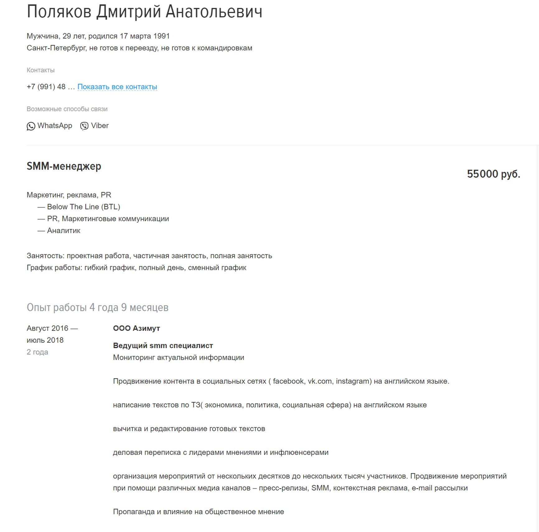 Многие из этих троллей (хотя и не все) оформлены на пригожинскую компанию ООО «Азимут». В своем резюме один из троллей (честно указавший предыдущее место работы) описывает свои обязанности как «деловая переписка с лидерами мнениями и инфлюенсерами, организация мероприятий от нескольких десятков до нескольких тысяч участников. Продвижение мероприятий при помощи различных медиа каналов — пресс-релизы, SMM, контекстная реклама, e-mail рассылки».