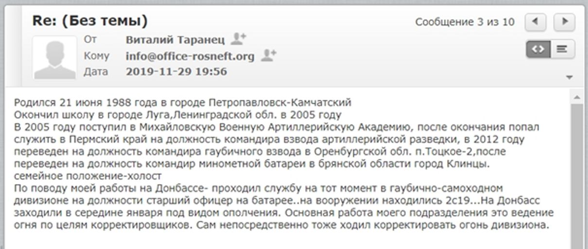 Хотя СБУ активно помогала операции, формально нужно было выставить все так, что СБУ о боевиках узнает случайно (ведь по легенде самолет сажают из-за звонка бдительного гражданина). Для этого придумали еще одну легенду: анонимный информатор сообщал СБУ о продолжающейся незаконной операции по вербовке наемников и называл адрес и пароль к электронной почте — info @rosneft-office. org. Как только СБУ отреагирует на такую наводку, они смогут загрузить все тысячи страниц компрометирующих документов, включая резюме, фотографии и видео. СБУ также сможет отслеживать подготовку к отъезду наемников из России с помощью билетов и планов полетов. И главное — они смогут немедленно отреагировать, как только обнаружат, что — случайно, после предупреждения о взрыве — самолет, на котором находились эти заинтересованные лица, приземлился в аэропорту Борисполь под Киевом.