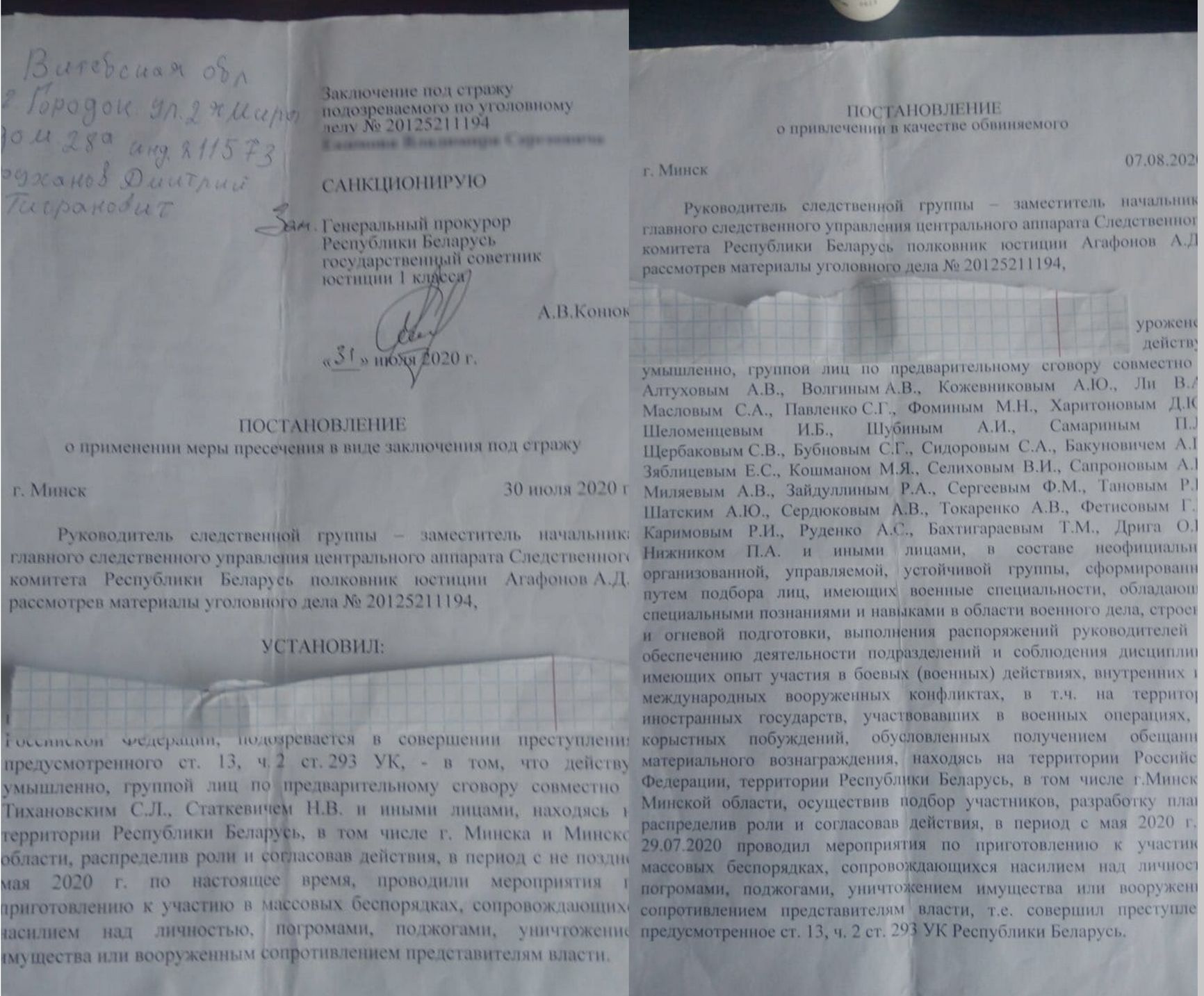 В конечном итоге наемникам было предъявлено обвинение в заговоре с целью свержения правительства и организации массовых беспорядков в сотрудничестве с арестованными деятелями оппозиции Тихановским и Статкевичем:
