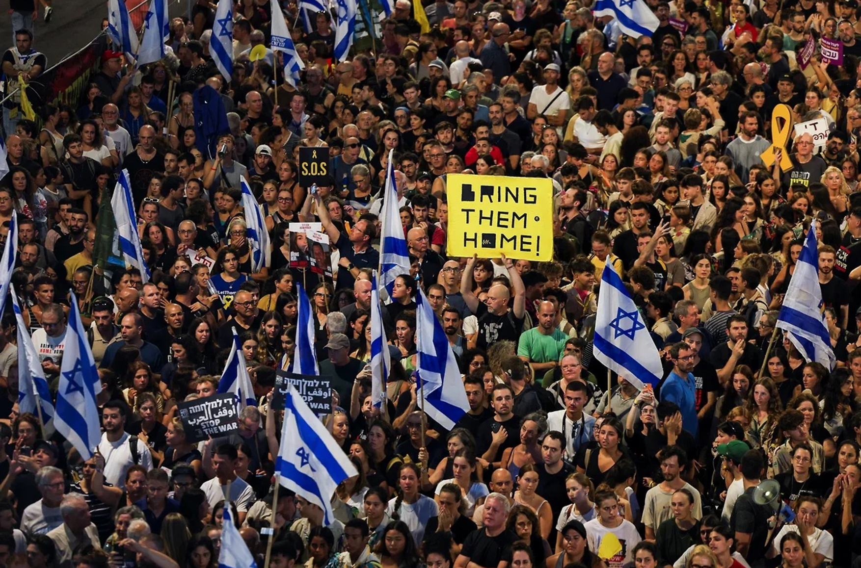 Форум пообещал «остановить жизнь в стране», призвав израильтян принять участие в массовых протестах, чтобы добиться от правительства скорейшего заключения сделки с ХАМАС. Десятки тысяч человек вышли на улицу. К протестам присоединилась и Всеизраильская ассоциация профсоюзов («Гистадрут»), объявив о всеобщей забастовке. Митинги продолжаются, пусть и с меньшим масштабом, но вот забастовка оказалась короткой — всего несколько часов. Окружной суд по трудовым спорам признал всеобщую забастовку политической, а не экономической, и постановил прекратить ее.